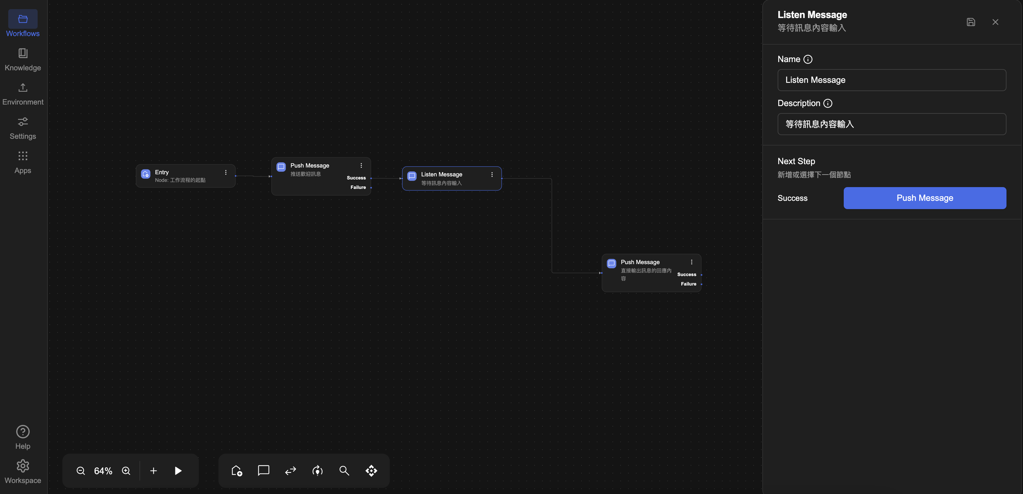 點選 Listen Message 進入編輯,於 Next Step 的 Success 分支,選擇刪除與 Push Message 節點之間的連接。
