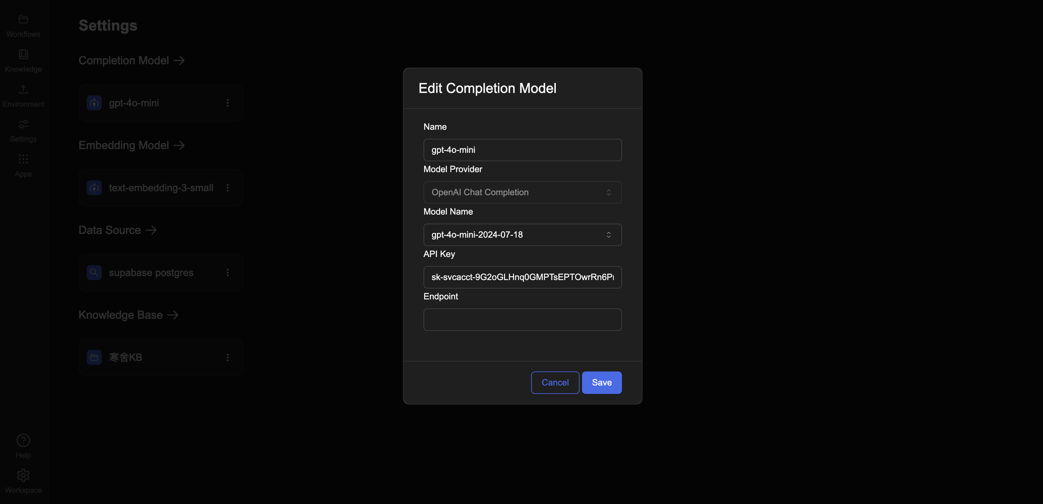 Completion Model 欄位中,從下拉選單選擇剛剛建立的模型:gpt-4o-mini