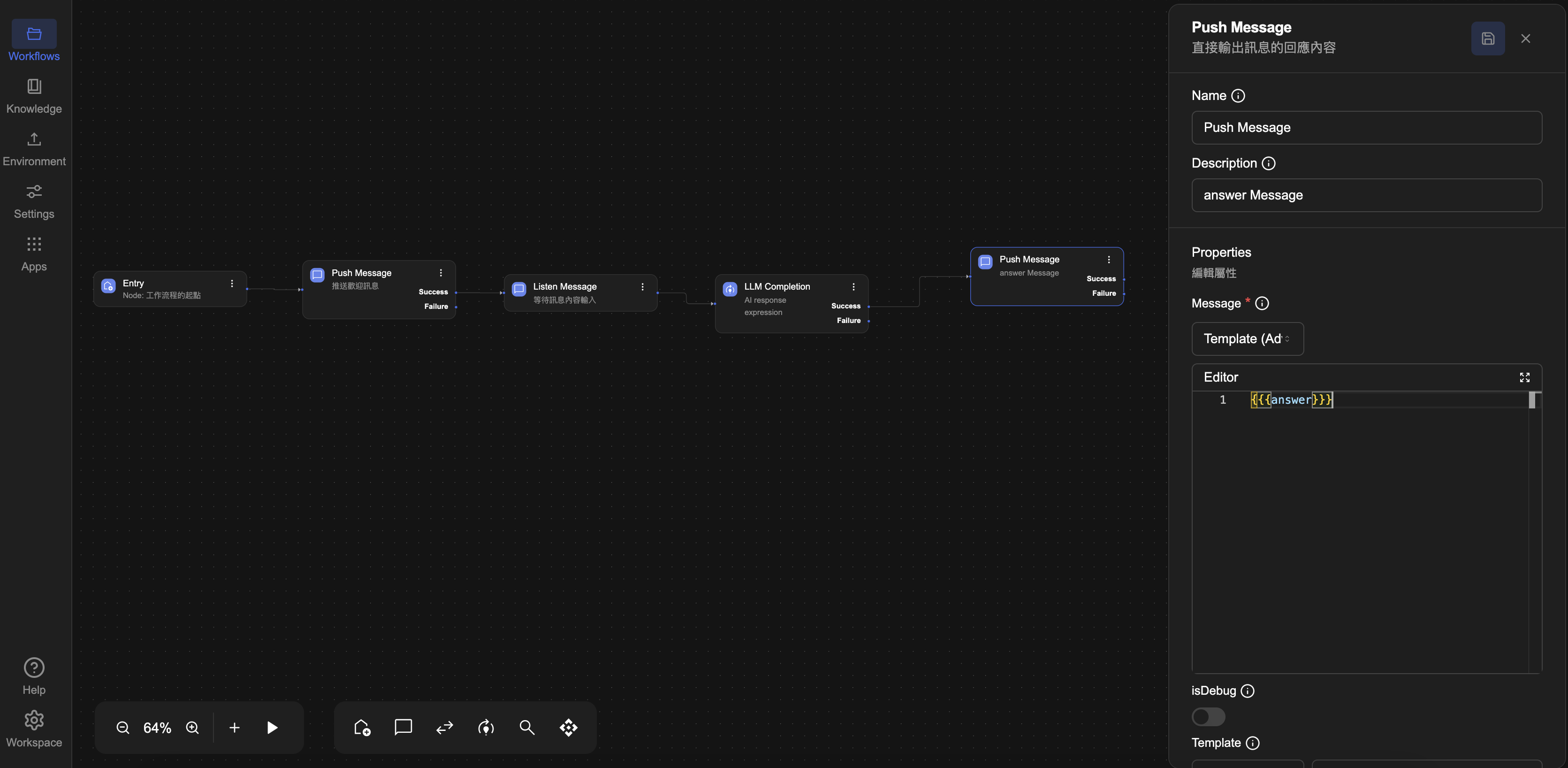 完成模型設定後,接下來點選左側選單中的 Workflow 分頁回到流程,設定 LLM Completion 節點的細節,讓 AI 能根據輸入產生回應。