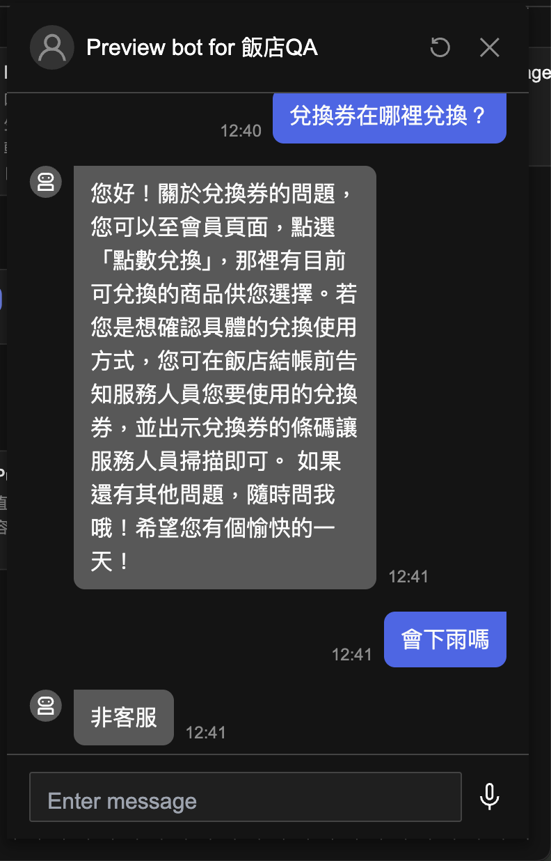 至此我們將客服 AI 做了情境脫離,客服 AI 能判斷是否為客服情境並搜尋知識庫內的知識做出自然語言的回應,假如用戶後續文題為上下文相關的話,客服 AI 能夠脫離情境,接續該問題回答。假如上下文不相關的話,客服 AI 能夠回到直接判斷的進入點,並判斷最後一則訊息是否為客服情境範圍,若不是客服情境則會出現非客服。點擊 Preview 來預覽並測試以下情境: