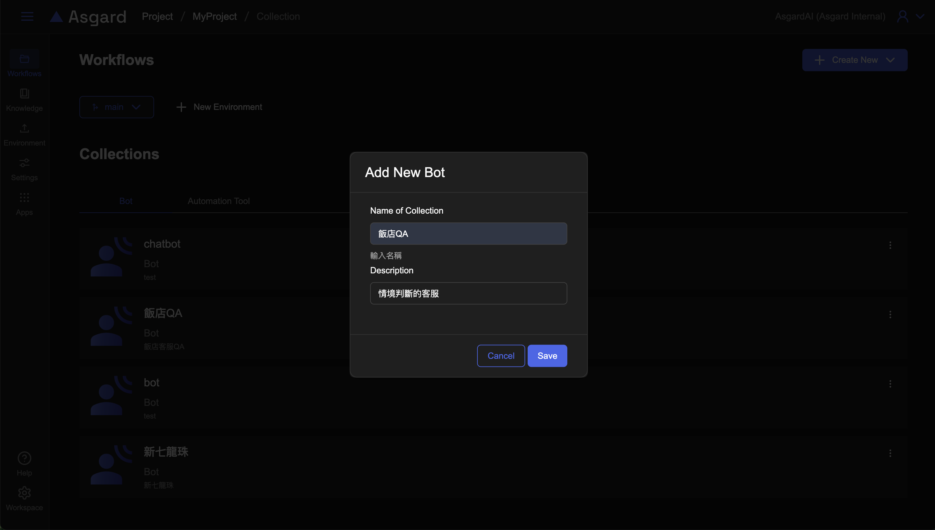 選擇 Project 進到該 Project 的 Collections 頁面,點擊右上方「Create New」選擇 Bot 類型建立,輸入名稱與描述建立後,可以在 Bot 分頁看到剛剛新建的 Bot。