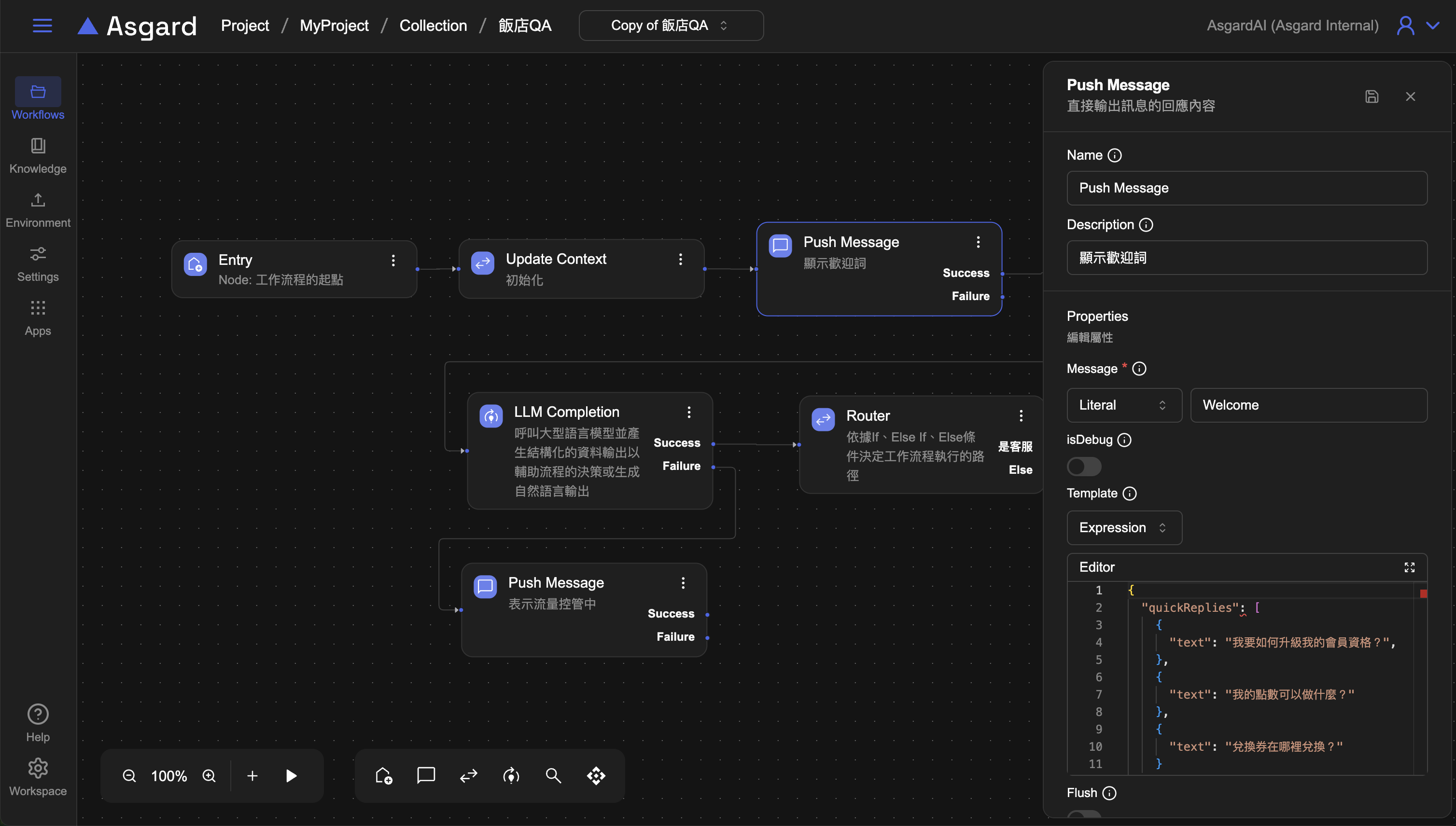 Push Message ,LLM 調用外部 AI model,通常會有調用成功與失敗兩種情況,當 Success 成立,就接到下一步的 Router 處理,當 Fail 時,可以加上 Push Message 來提示用戶。