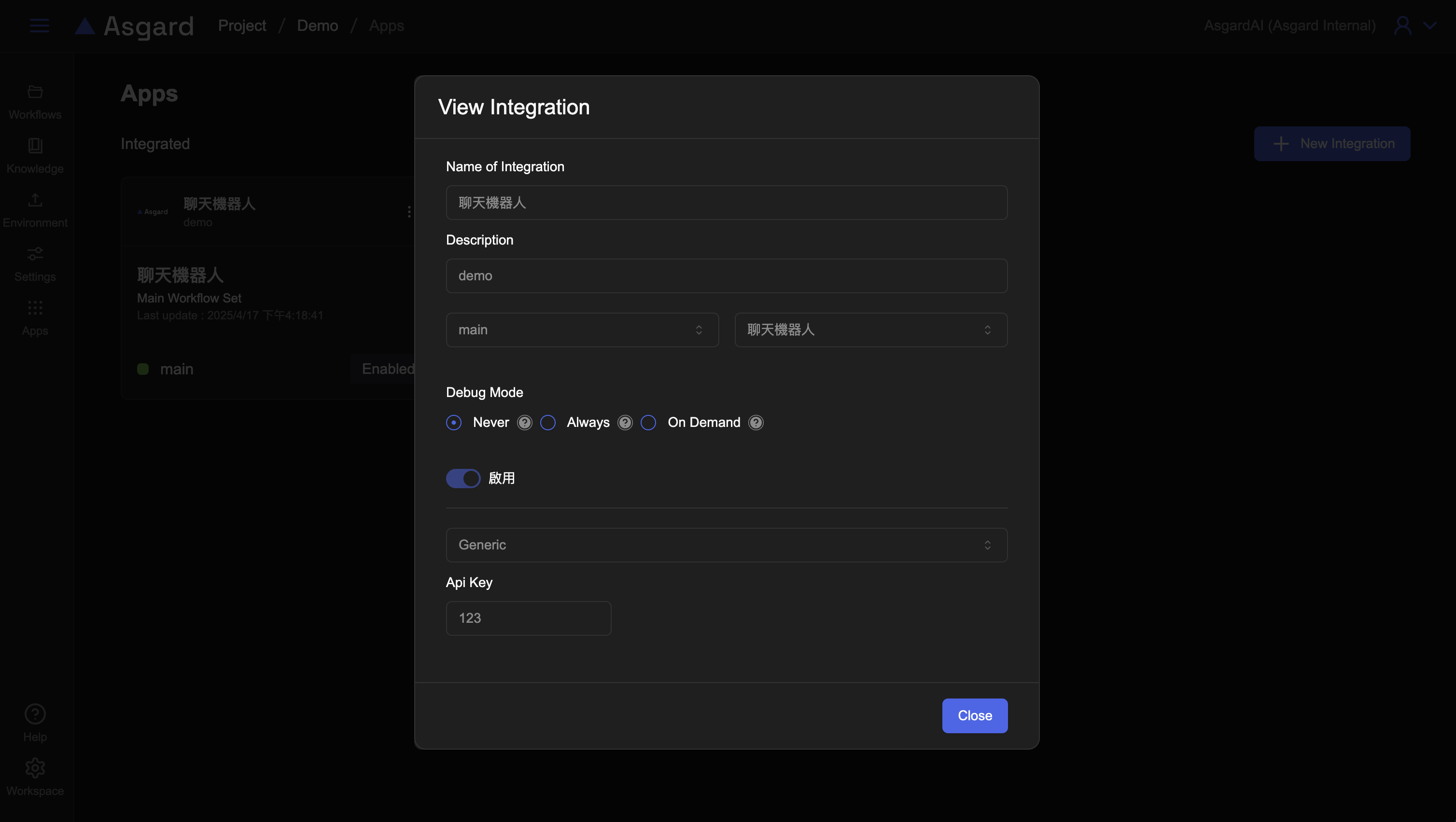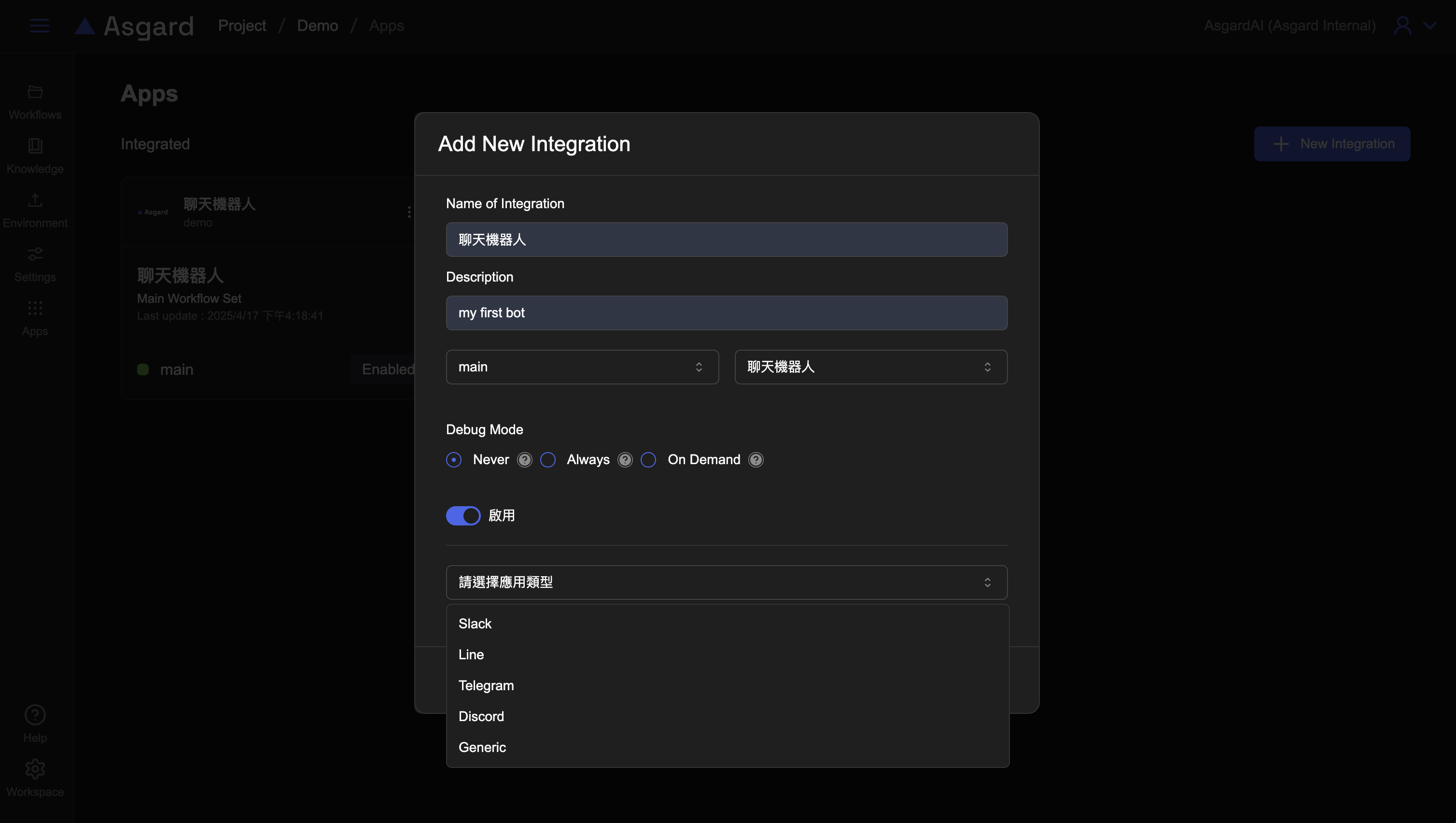 點擊左側 Apps 功能進入 AI App 功能區,首次進入會是空的,請點擊 New Integration 來建立一個新的 AI App 整合應用。接著填入對應的資訊並選擇應用類型即可,預設建立完成後會自動啟用該 App。