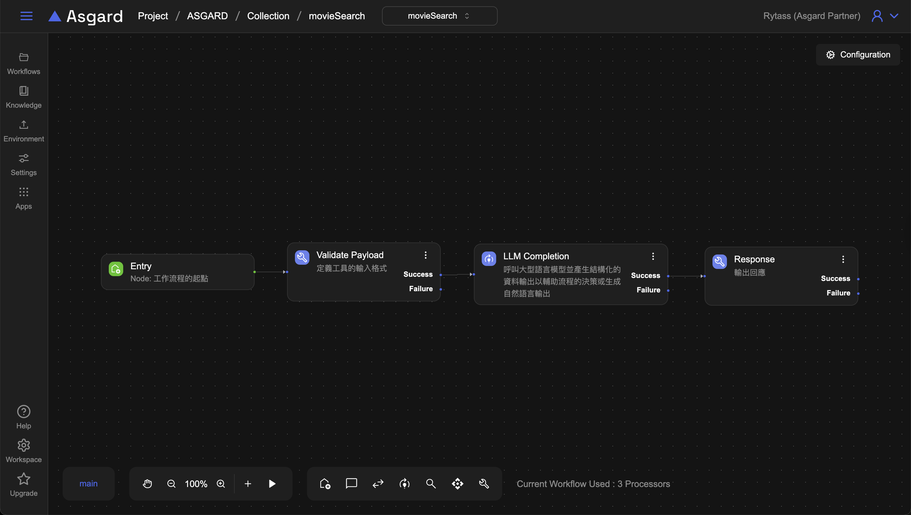 接下來的步驟會依序建立下方列出的 Processors,讓 AI 協助我們根據送進來的關鍵字,先判斷最接近哪一部電影,然後將電影名稱的中英文名稱與上映時間,以文字陣列格式回傳。