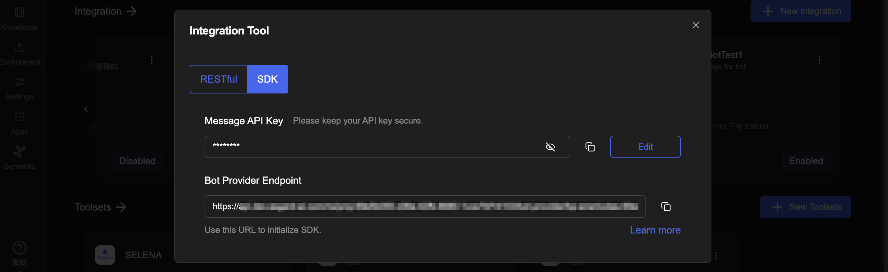 使用 Generic (Bot) 類型的應用,會提供 RESTful 與 SDK 兩種模式,可依使用情境選擇: