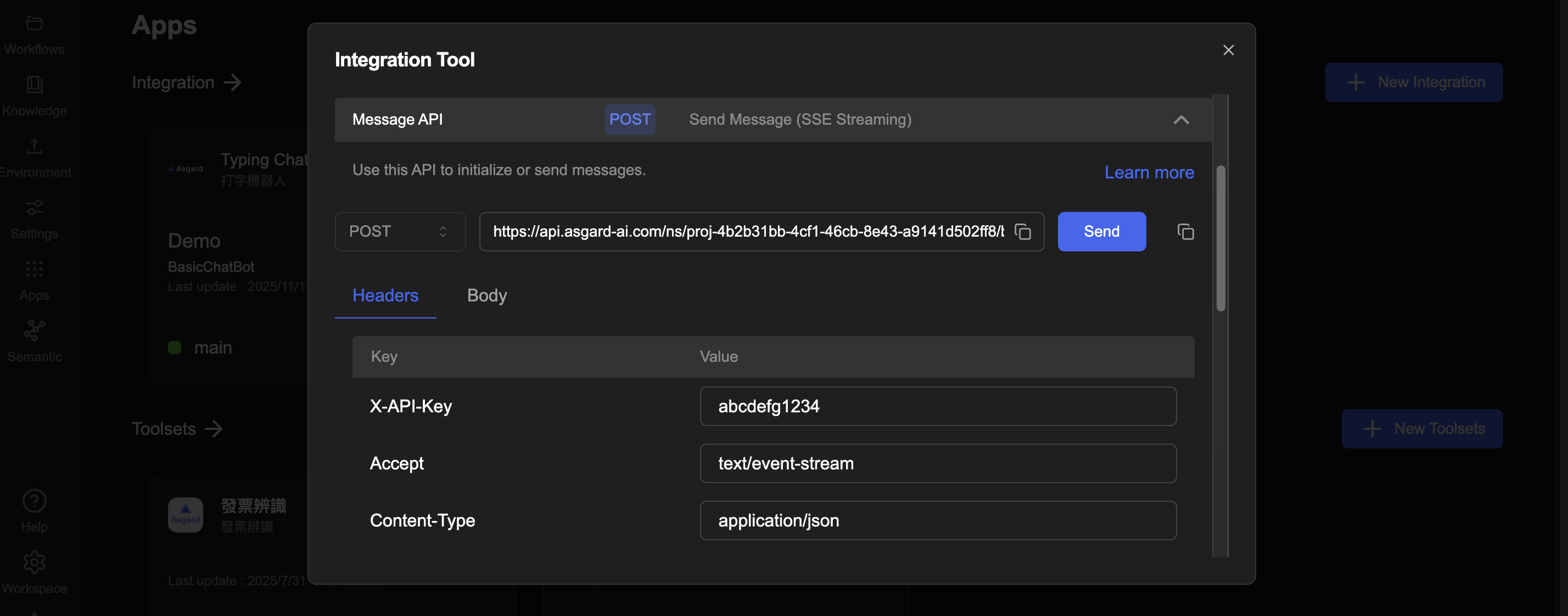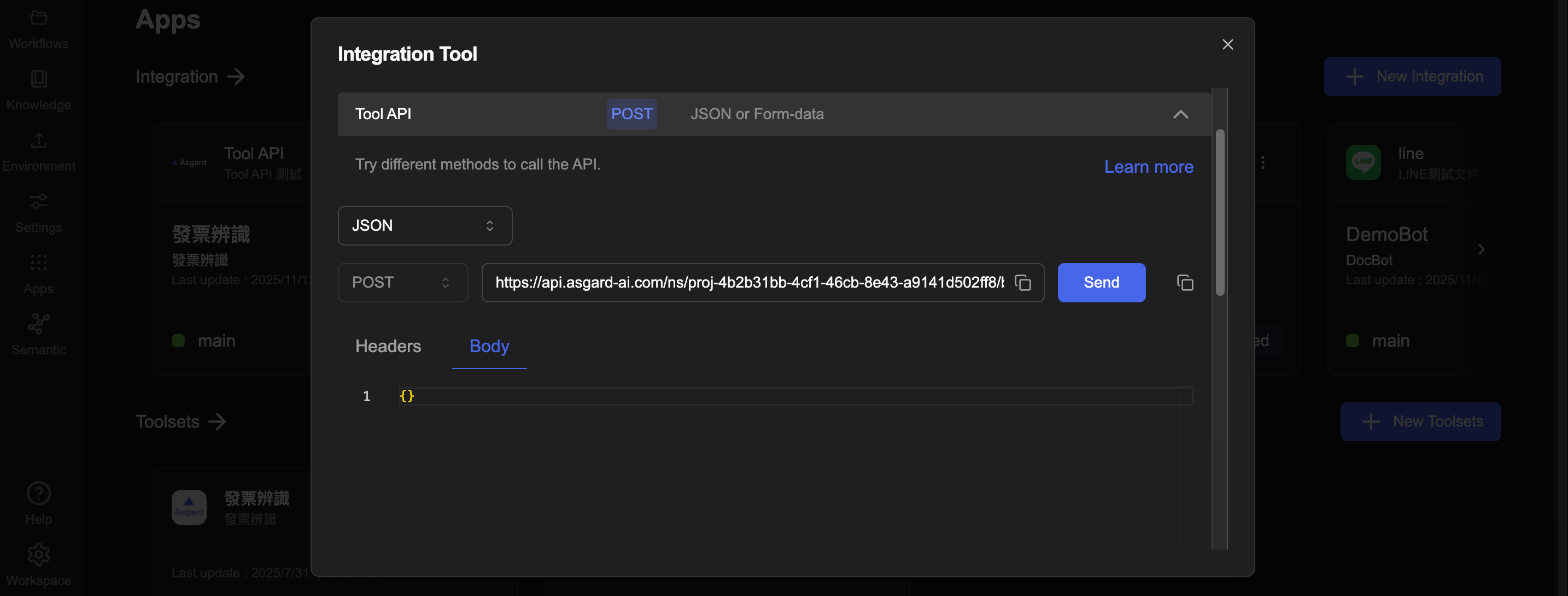 Asgard 的 Integration Tool 讓您直接在瀏覽器測試 Asgard API,不用再額外開 Postman。