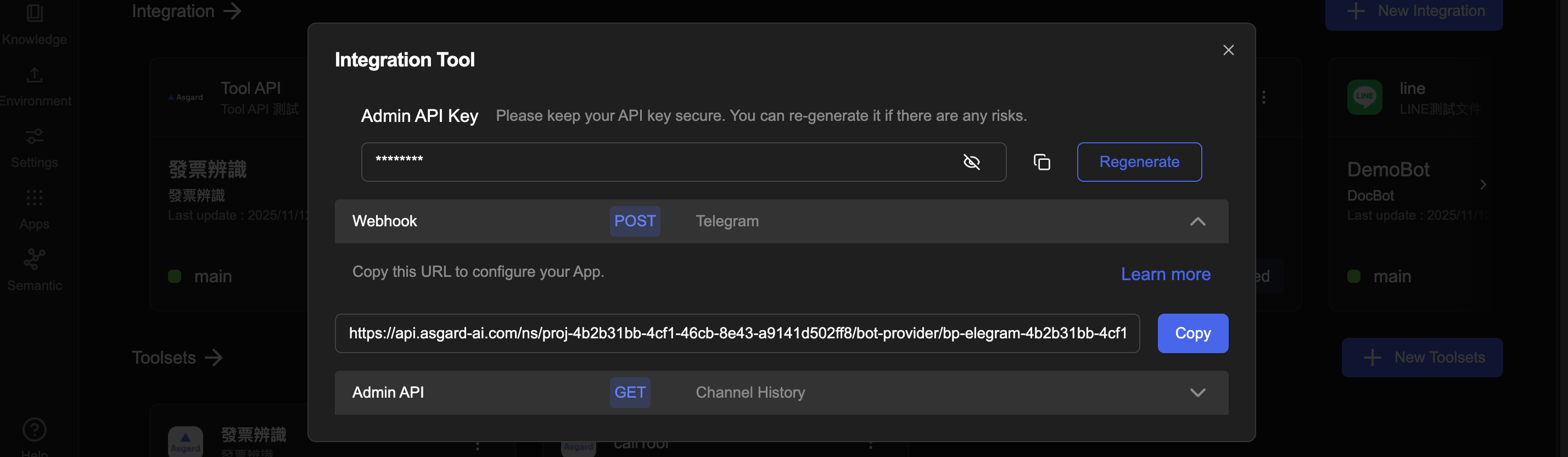 | Message API Key | Generic (Bot) | 呼叫 Message API 時填入。 | 點右側複製圖示即可貼用;要換新 Key,按 Edit 回到 Integrated 編輯模式,在 Auth 設定重新儲存即可。 |