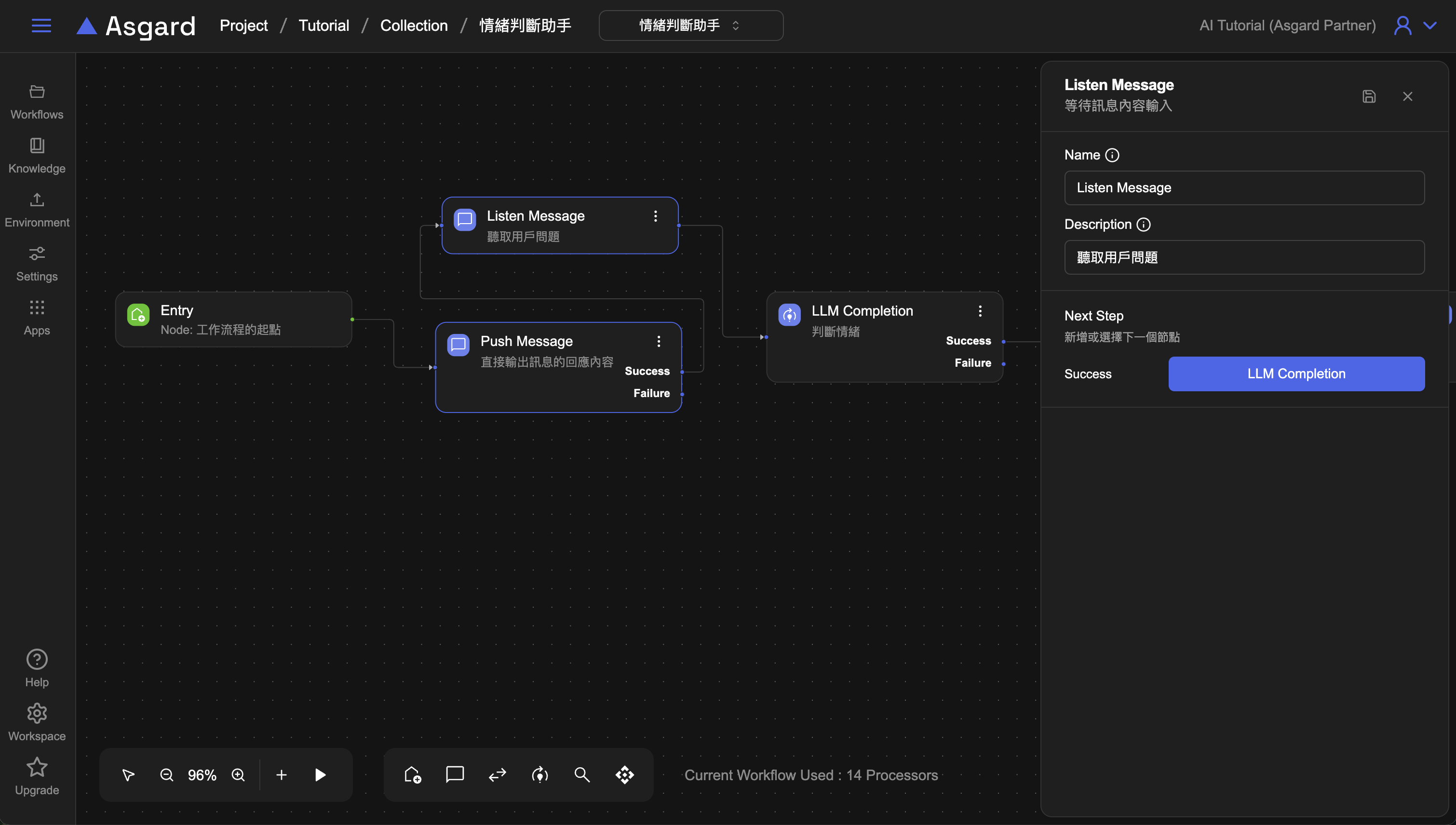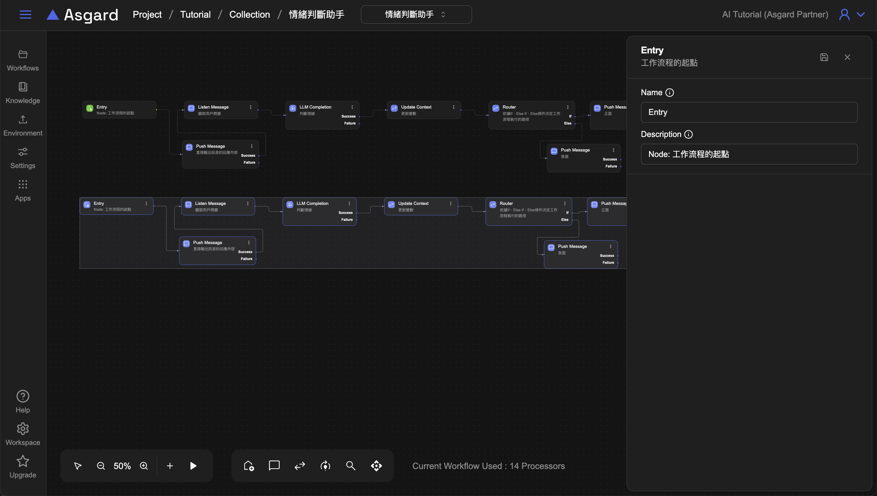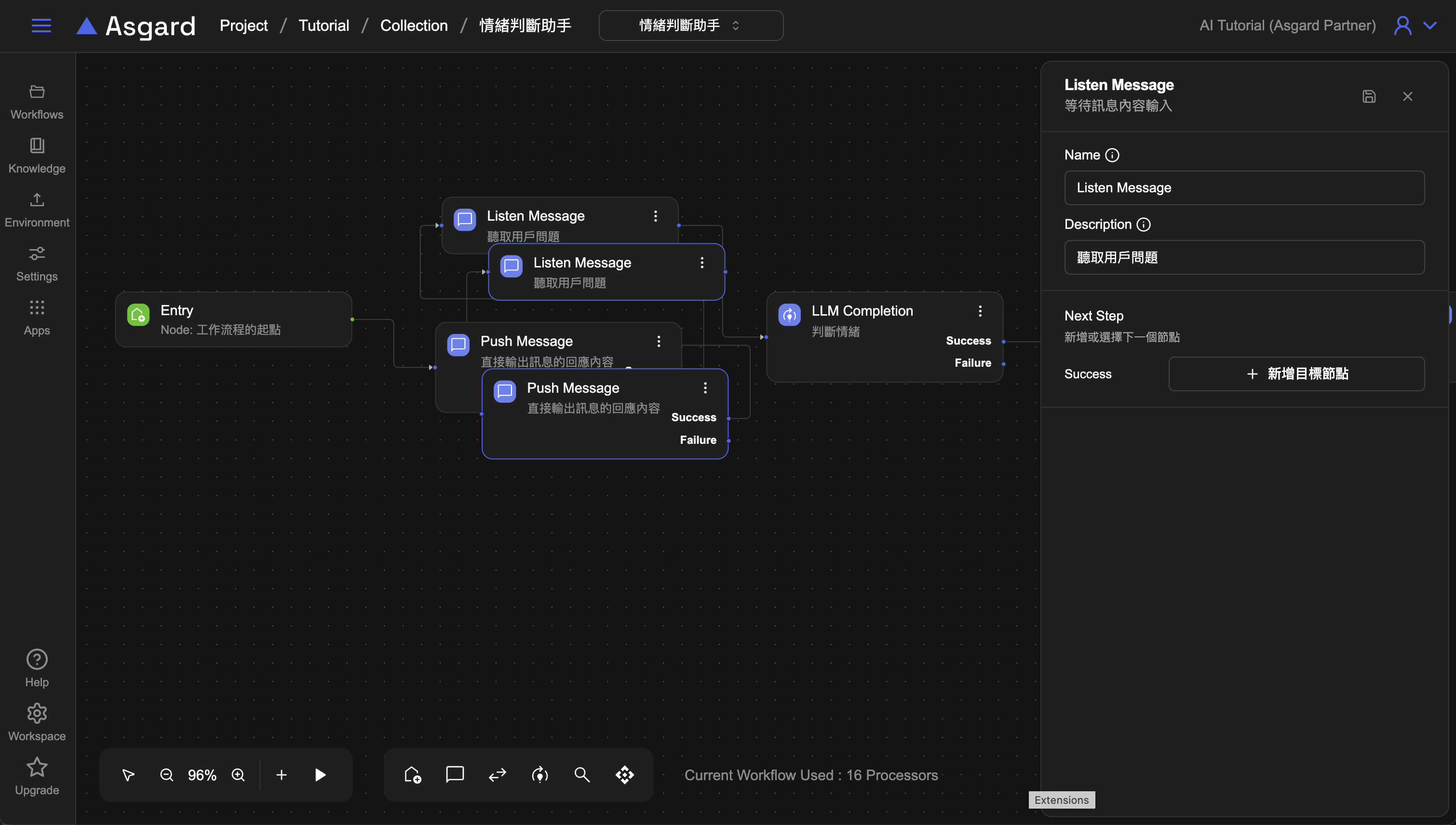 Workflow 的工作流程編排區,有兩種滑鼠的模式:拖拉移動與選取節點,方便切換不同功能的操作。