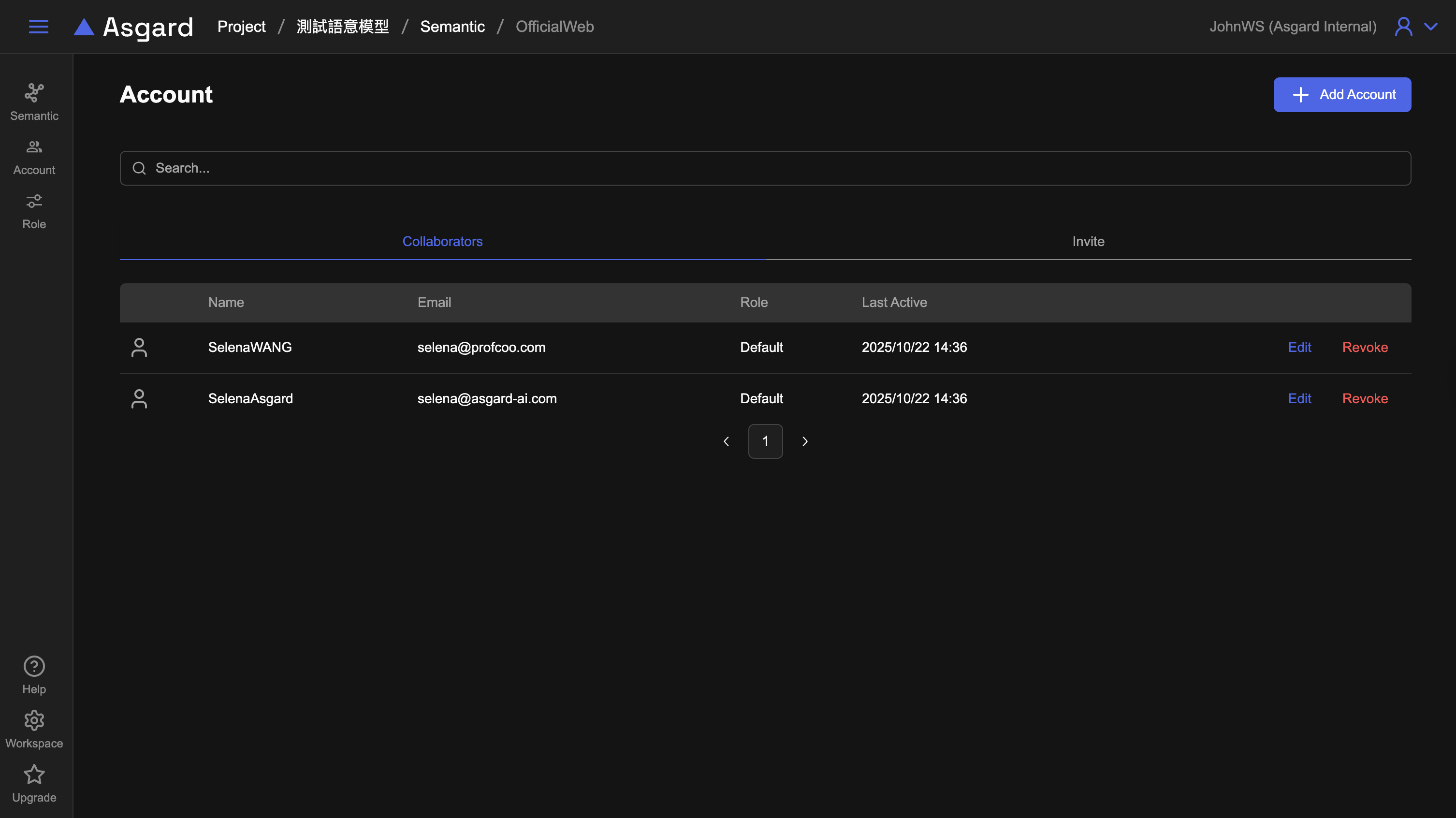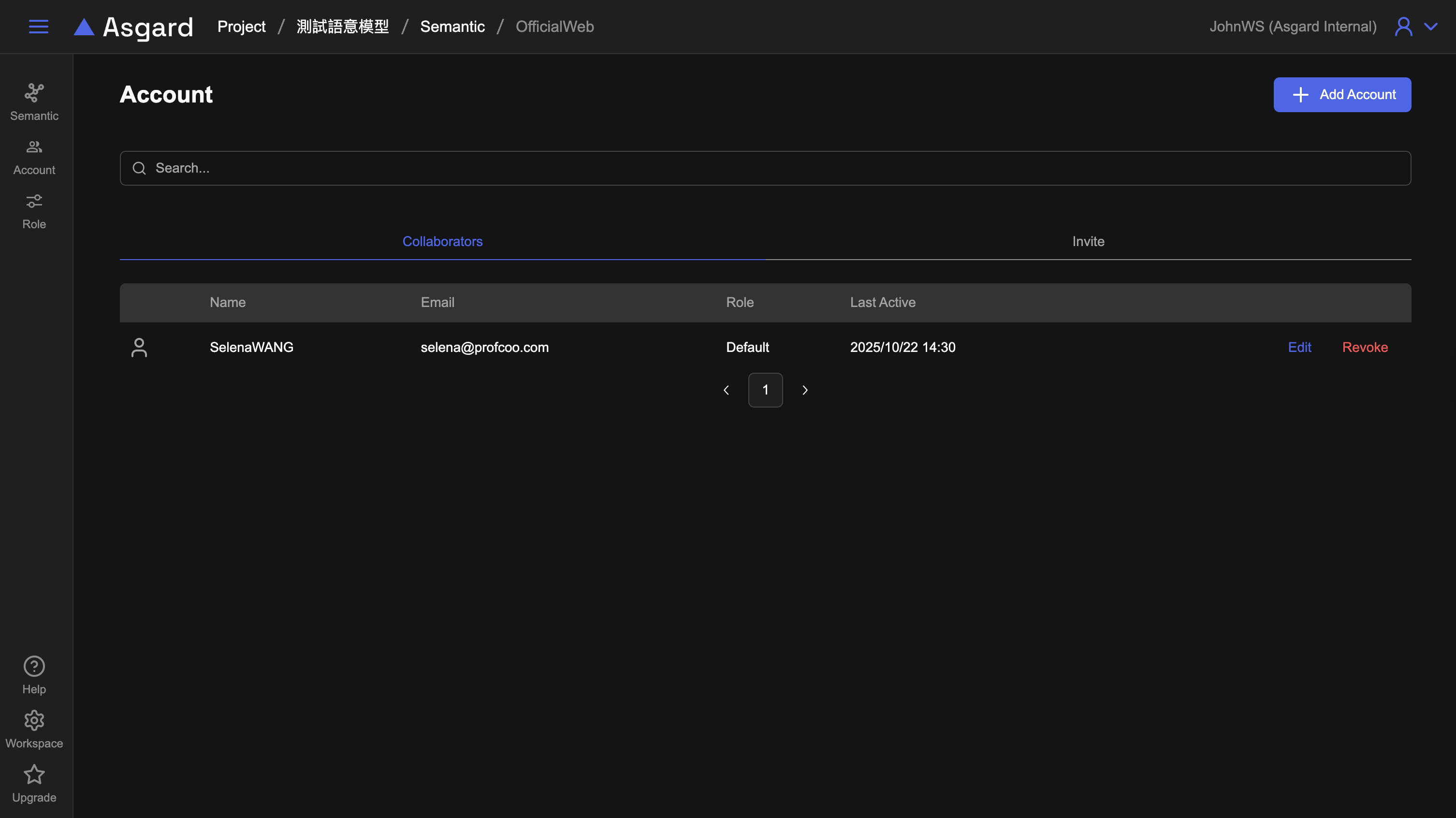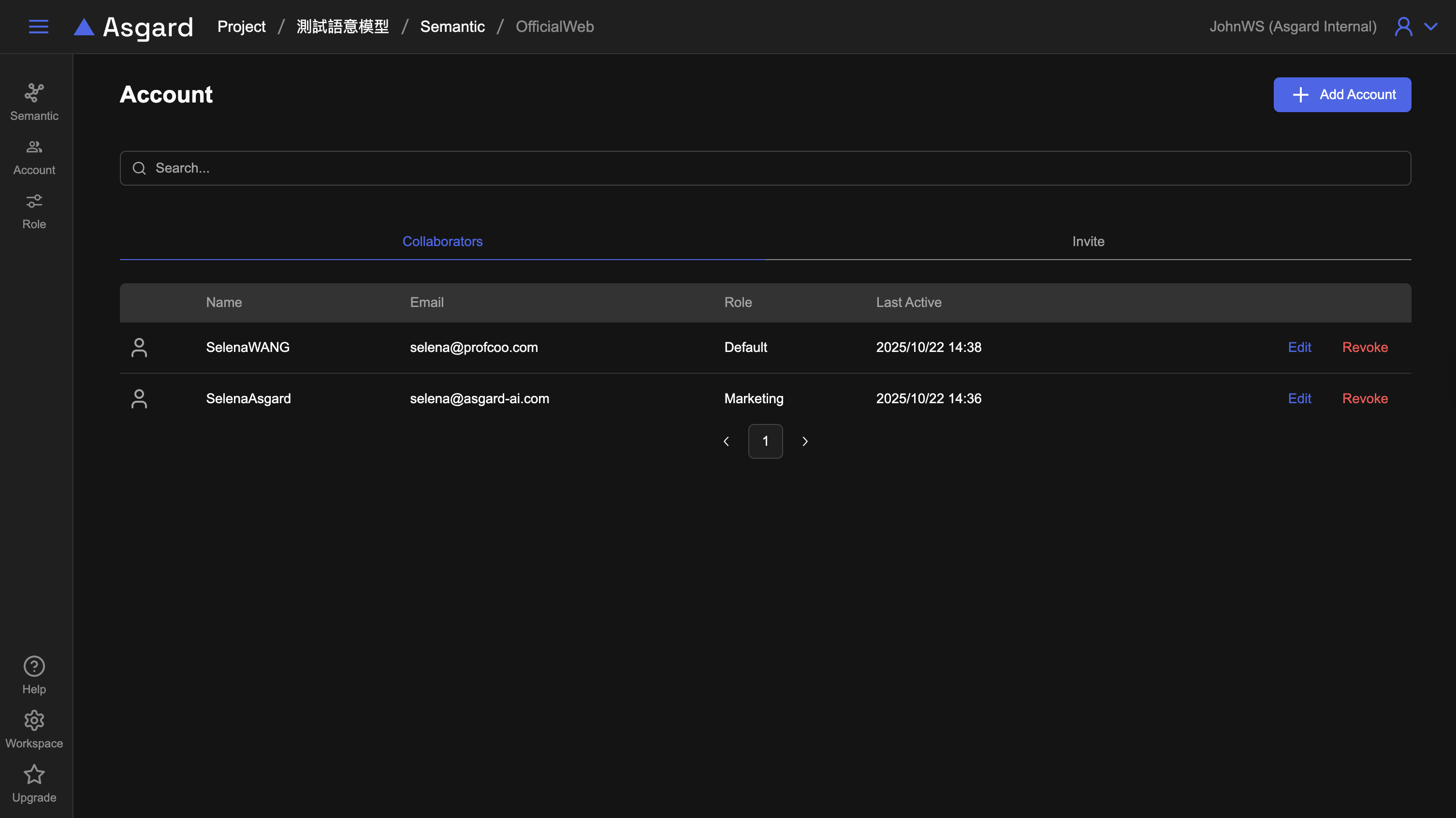 此處可以檢視已加入的成員以及邀請時指派的角色,您可以管理編輯該帳號的角色或是移除該帳號權限。