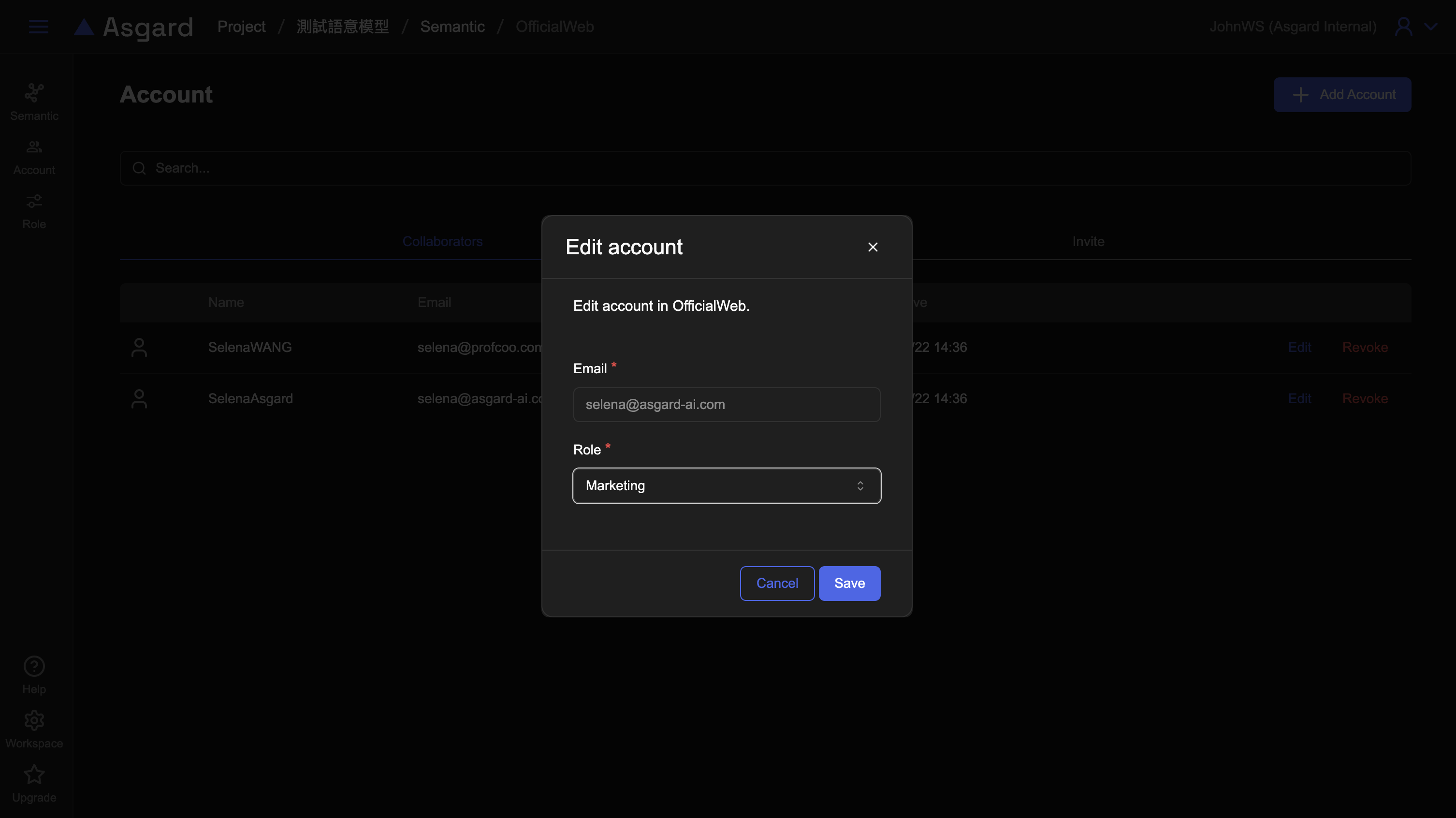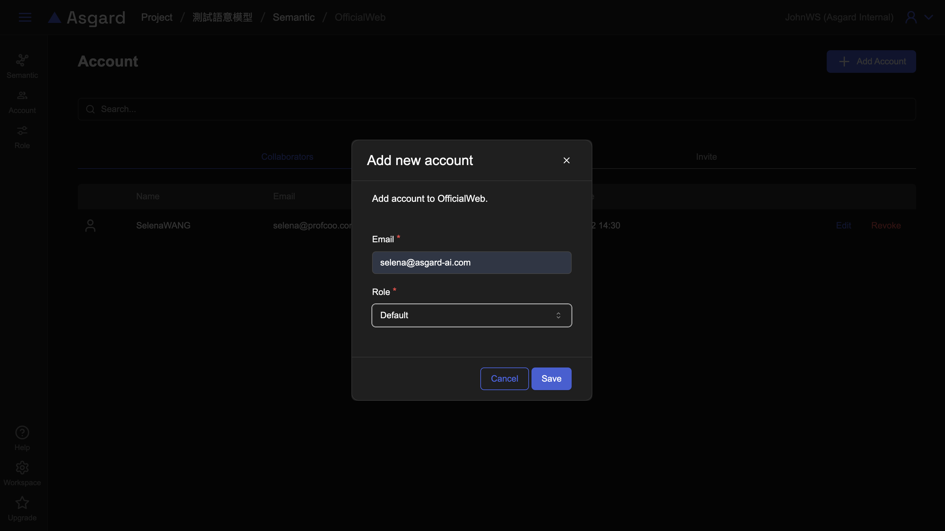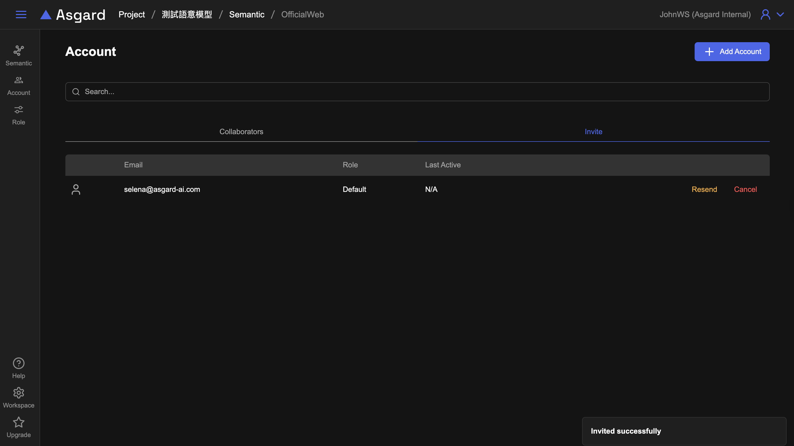 您可以點擊「Add Account」邀請新成員,請輸入新成員的 Email 並指派對應角色權限後儲存即可。