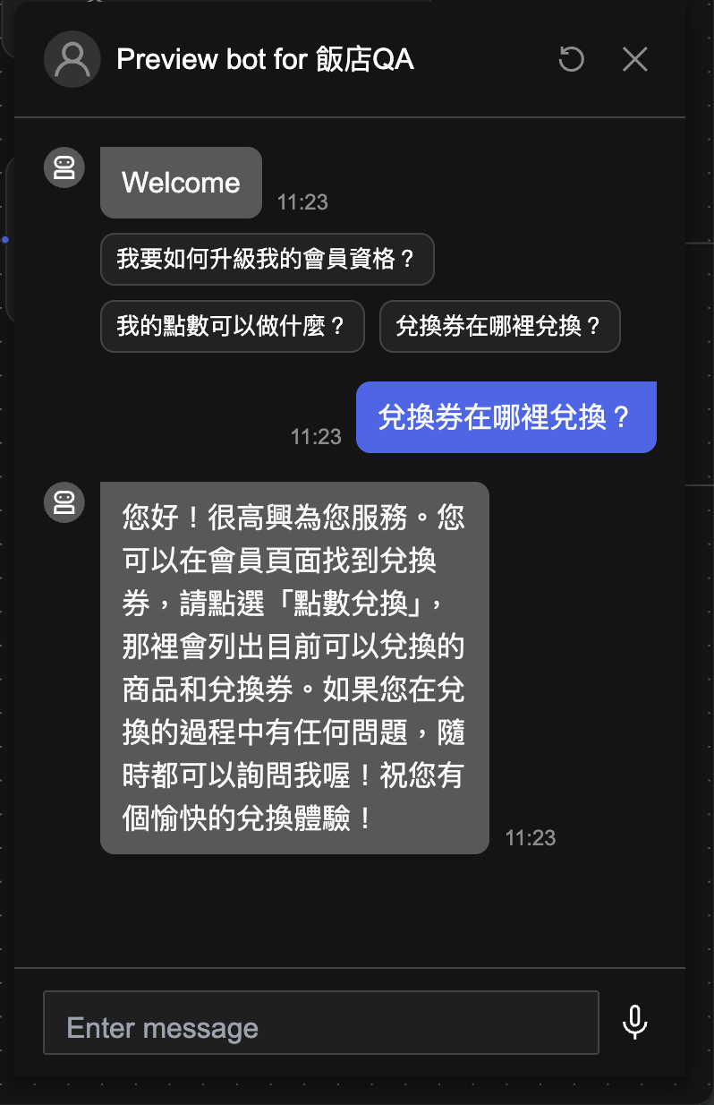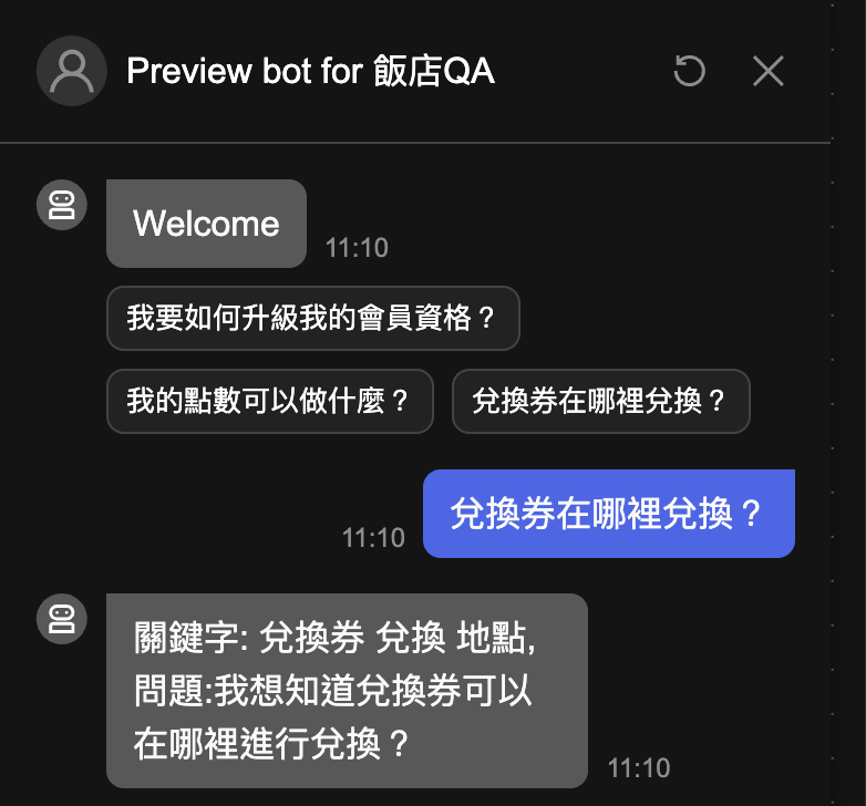 至此我們將客服 AI 做了更完善的改良,客服 AI 除了能判斷是否為客服情境之外,還能搜尋知識庫內的知識做出自然語言的回應。點擊 Preview 來預覽並測試以下情境: