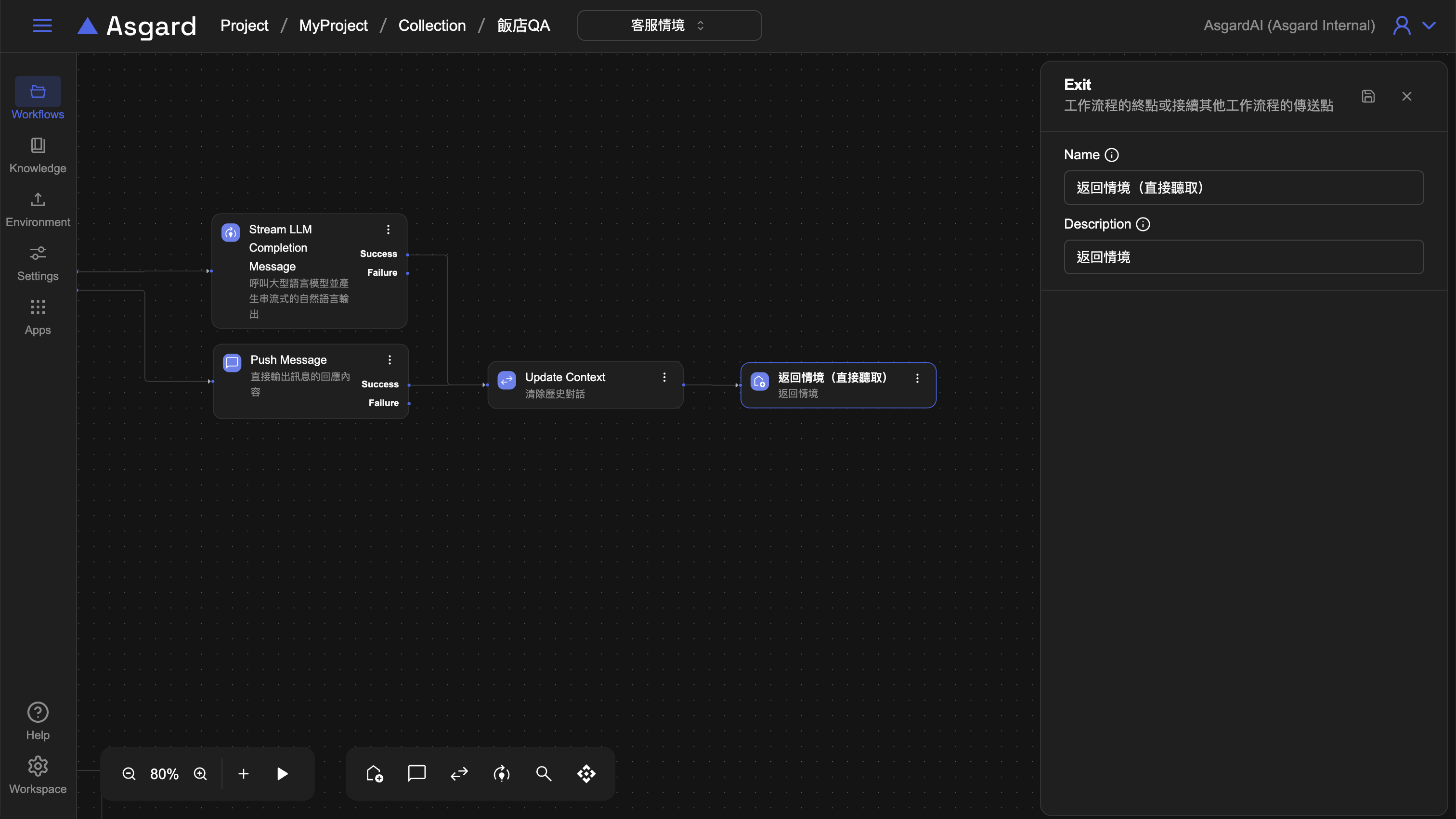 historySize為 Asgard 內建函數,historyStart 為先前在 Update Context 裡所新增的變數,historySize 是指訊息的總量,每一則訊息都會記算一筆,算到上一個對話為止,因此這裡是將 historyStart 更新為 historySize,讓 AI 從新一輪的對話開始。