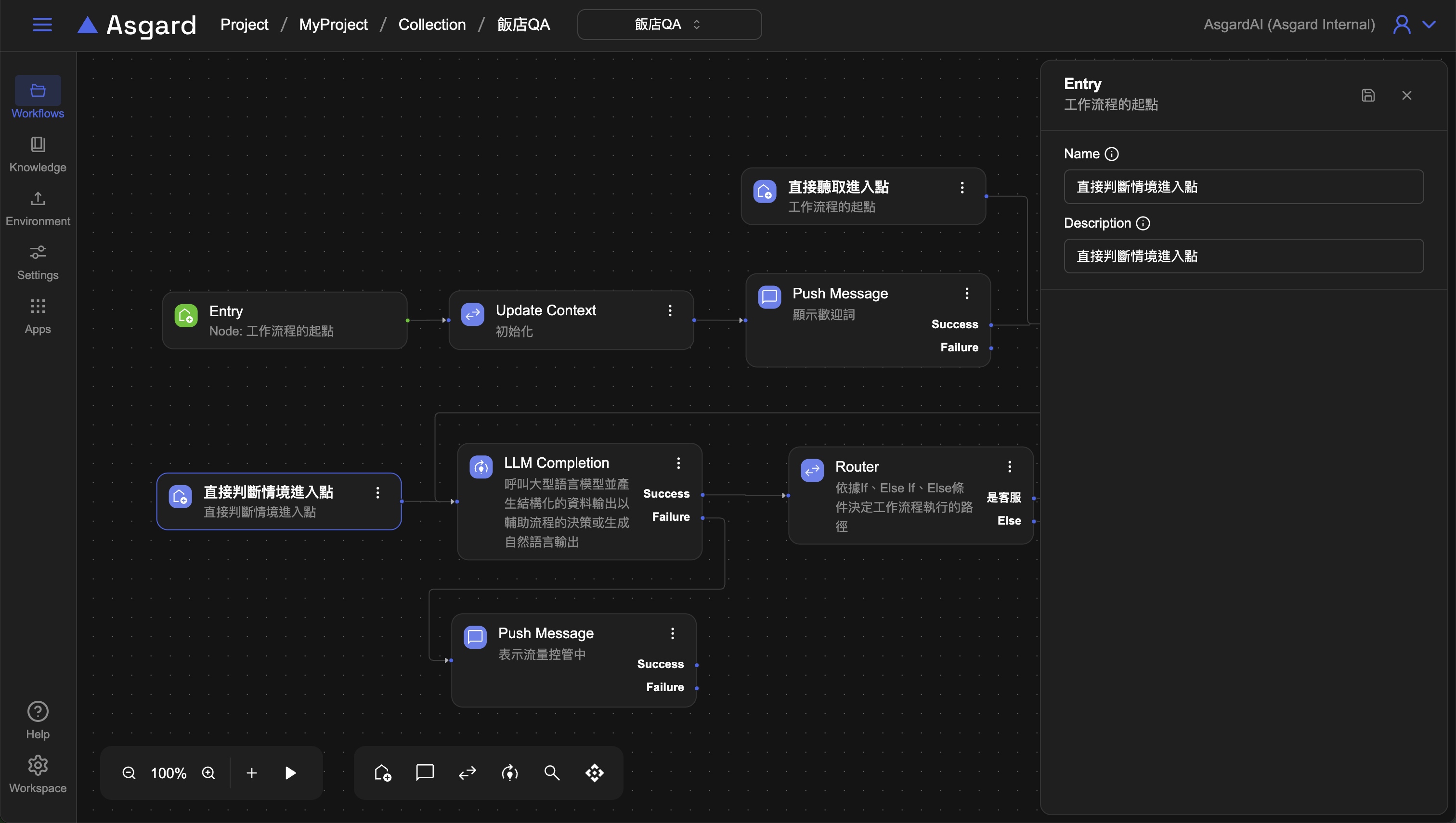回到飯店 QA 的 Workflow 並新增一個進入點,可直接點擊上方的飯店 QA 回到 Workflow Sets 選取或是使用頂端列的選單切換,新增後修改名稱與描述為「直接判斷情境進入點」,並將該節點連接到 Listen Message。