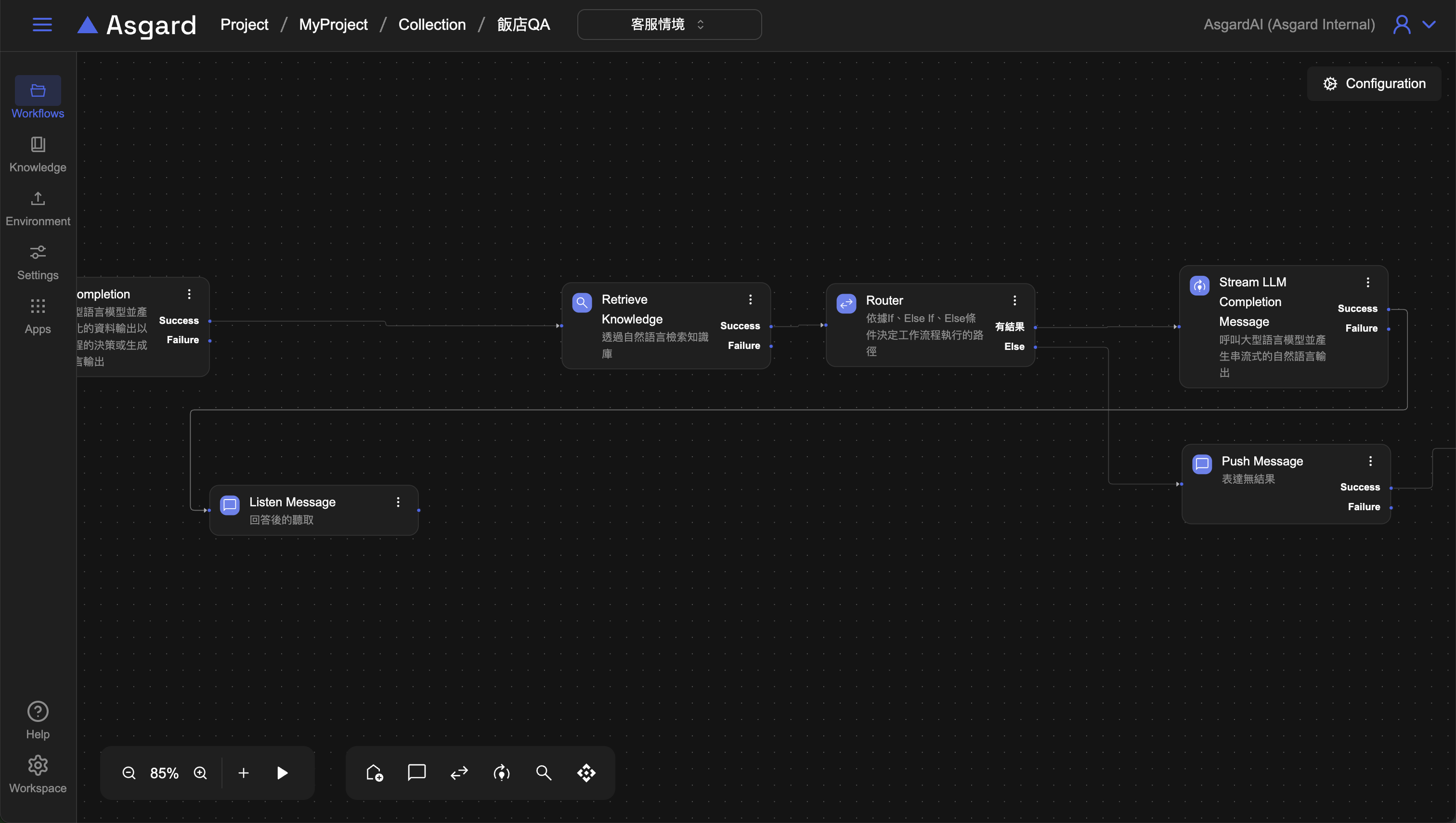 history為 Asgard 內建函數,historyStart 為步驟 2 時在 Update Context 裡所新增的變數,-1 是指算到上一個對話為止,因此這裡是在告訴 LLM 用戶的歷史對話紀錄是從 historyStart 到上一個對話,也就是上一步的 Listen Message 用戶輸入的問題。prevMessage也是 Asgard 內建函數,即為前一個對話。