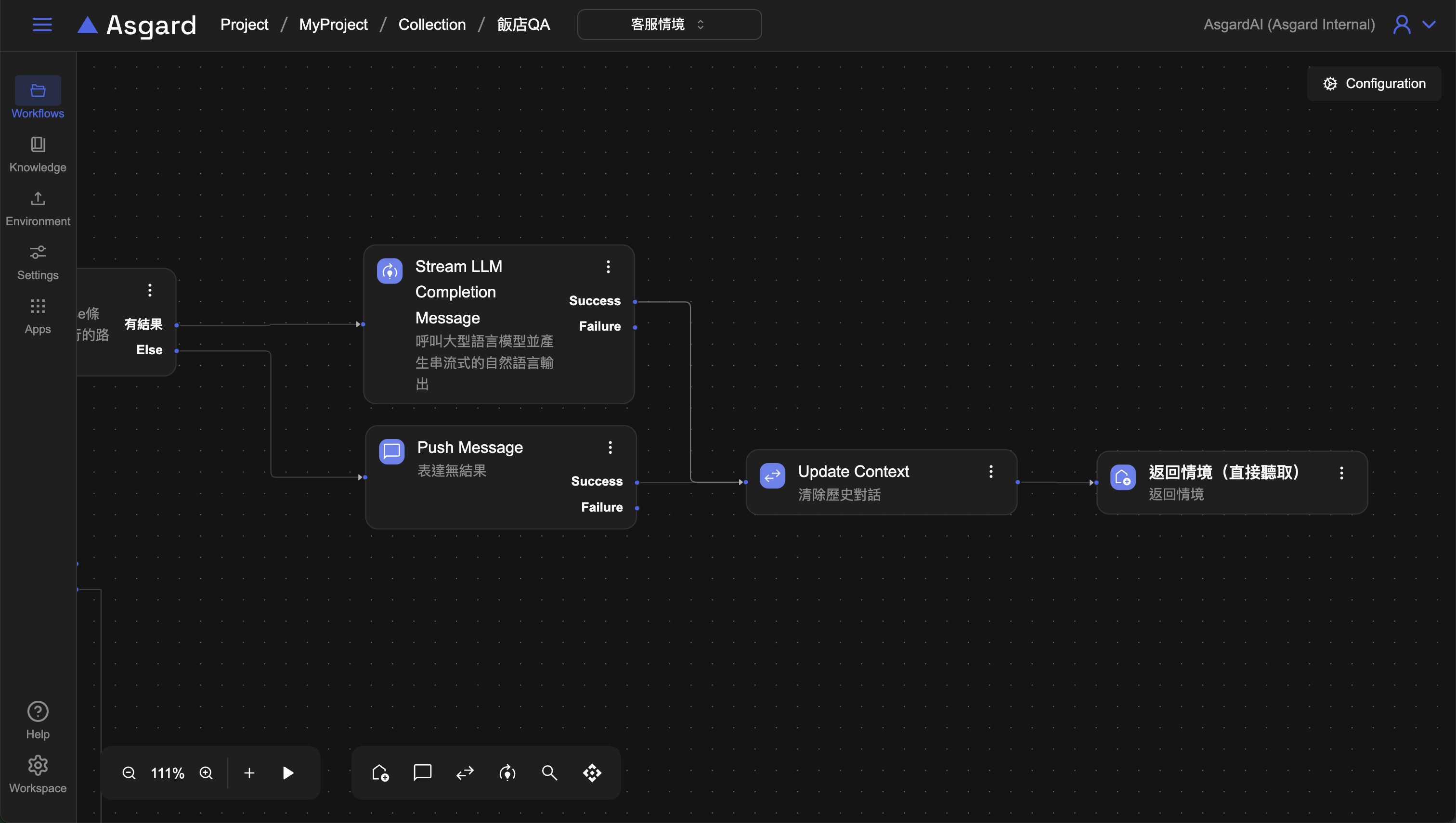 historySize為 Asgard 內建函數,historyStart 為先前在 Update Context 裡所新增的變數,historySize 是指訊息的總量,每一則訊息都會記算一筆,算到上一個對話為止,因此這裡是將 historyStart 更新為 historySize -1,即為最後一則對話。