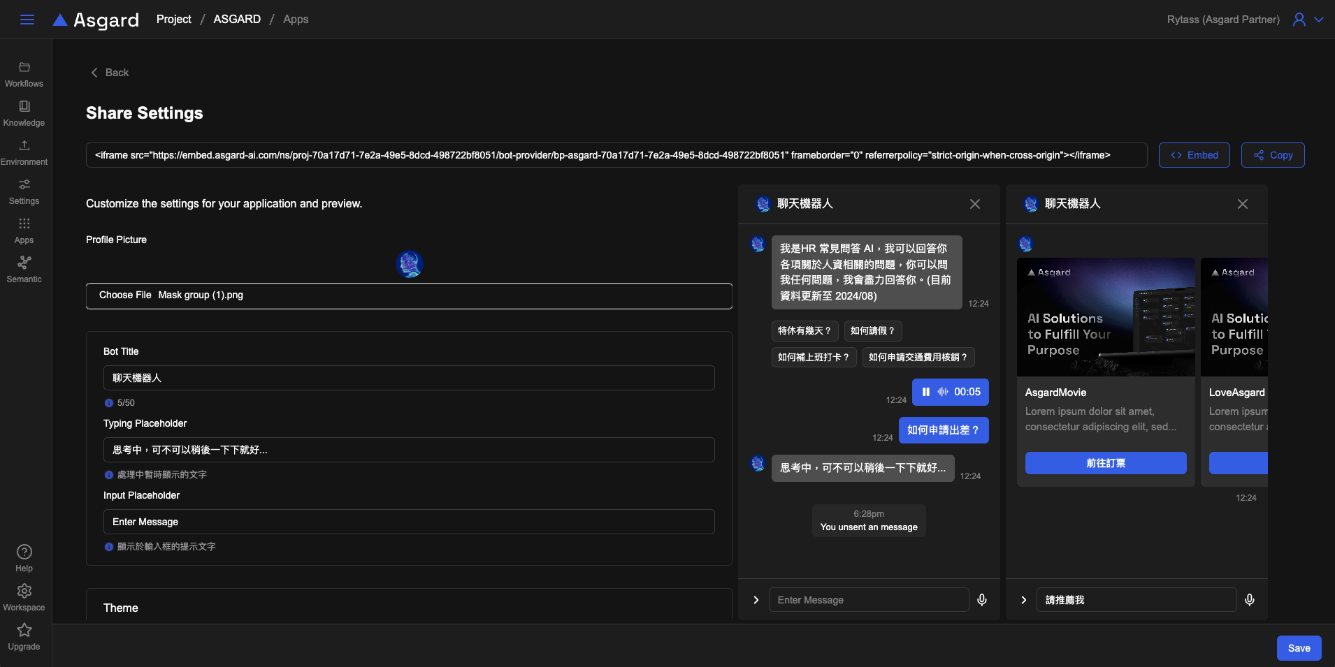 • 修改標題(Bot Title)與處理中暫時顯示(Typing Placeholder)的文字。