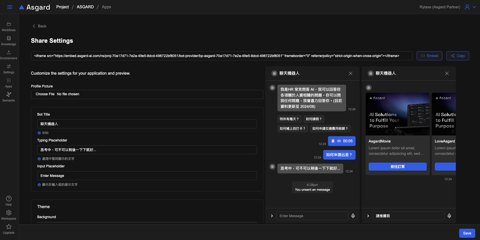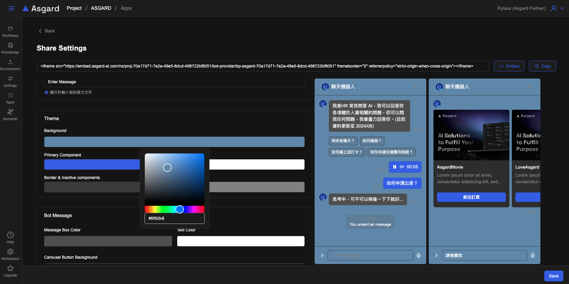 • 客製化設定頁面 左側可以設定 iFrame 的客製化設定包含背景色、文字顏色與機器人顯示圖片。右側預覽視窗可以即時預覽修改後的 iFrame。