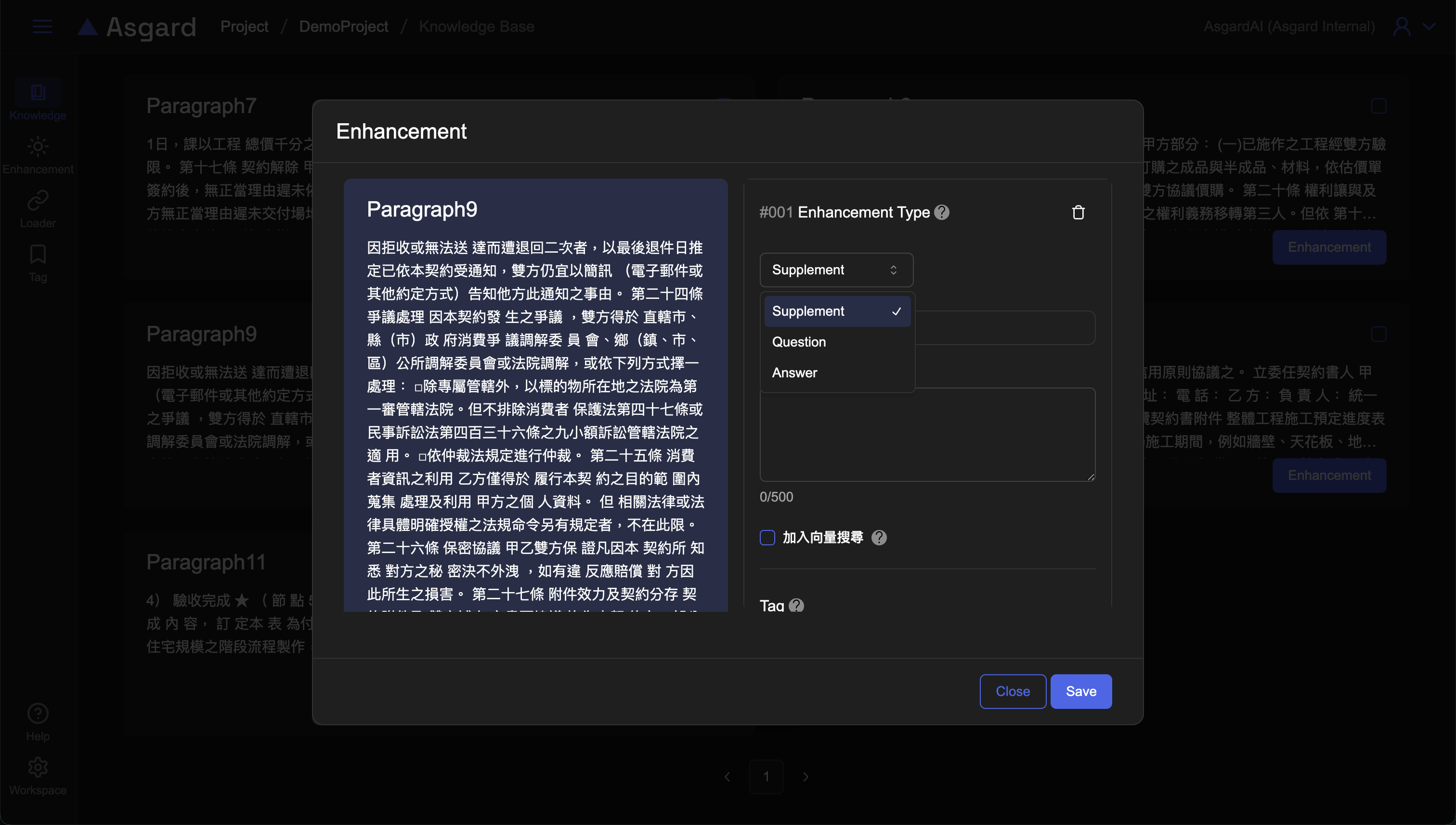 Enhancement 有三種增強類型可以選擇:補充內容(Supplement)、問題(Question)、答案(Answer)。在填寫增強時,也可以加上標籤(Tag)方便快速尋找相關內容或是在設定 Retrieve Knowledge Processor 時,去設定是否限制資料至少需要滿足該組標籤清單的其中一個標籤才會作為查詢結果。