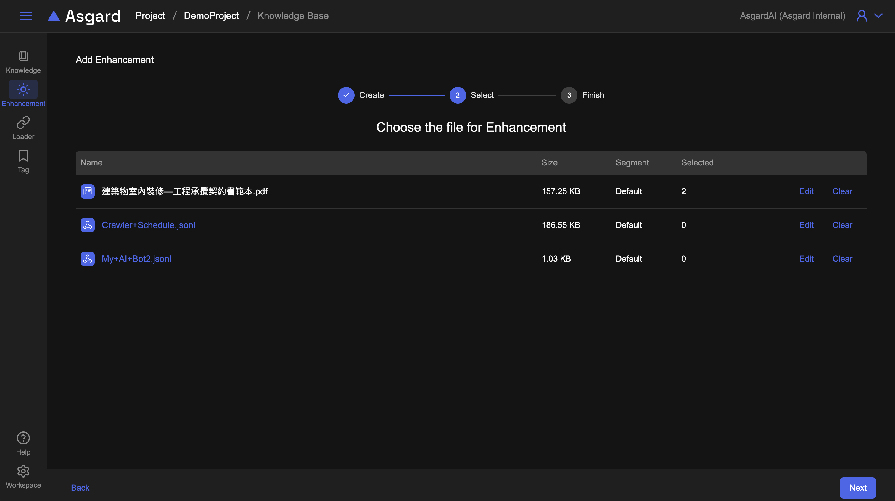 在基本的 RAG 功能之上,您可以隨心所欲地在檔案分段裡添加增強(Enhancement)以促進 AI 理解的程度。您可以在檢視檔案分段時新增 Enhancement 或是統一在 Enhancement 管理頁面新增。