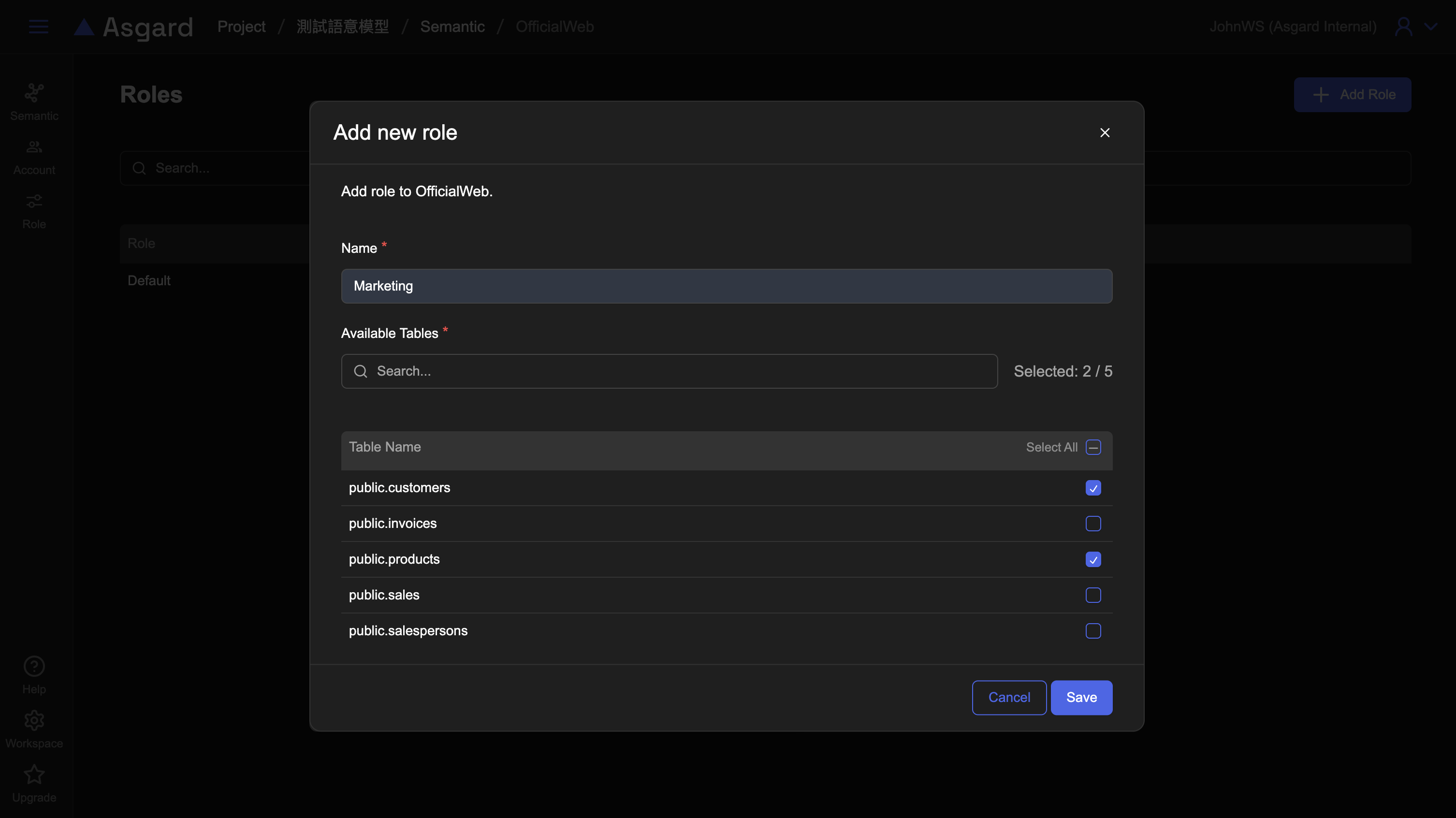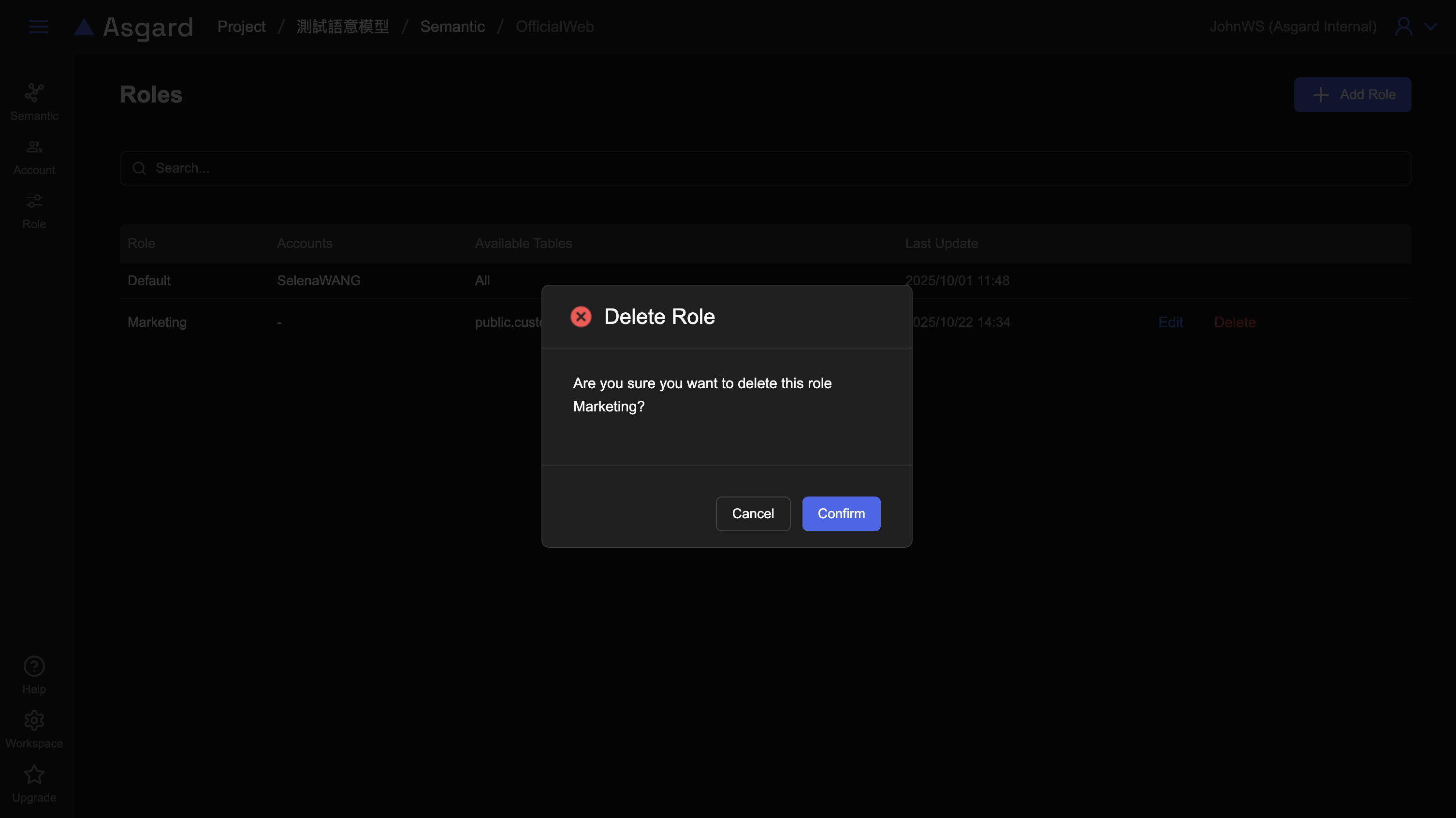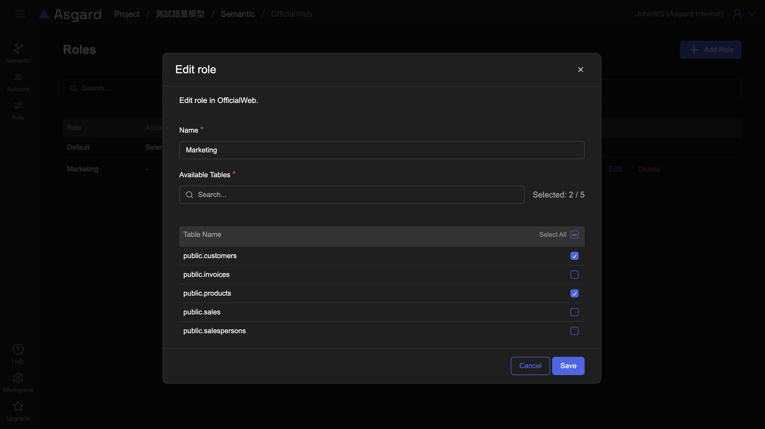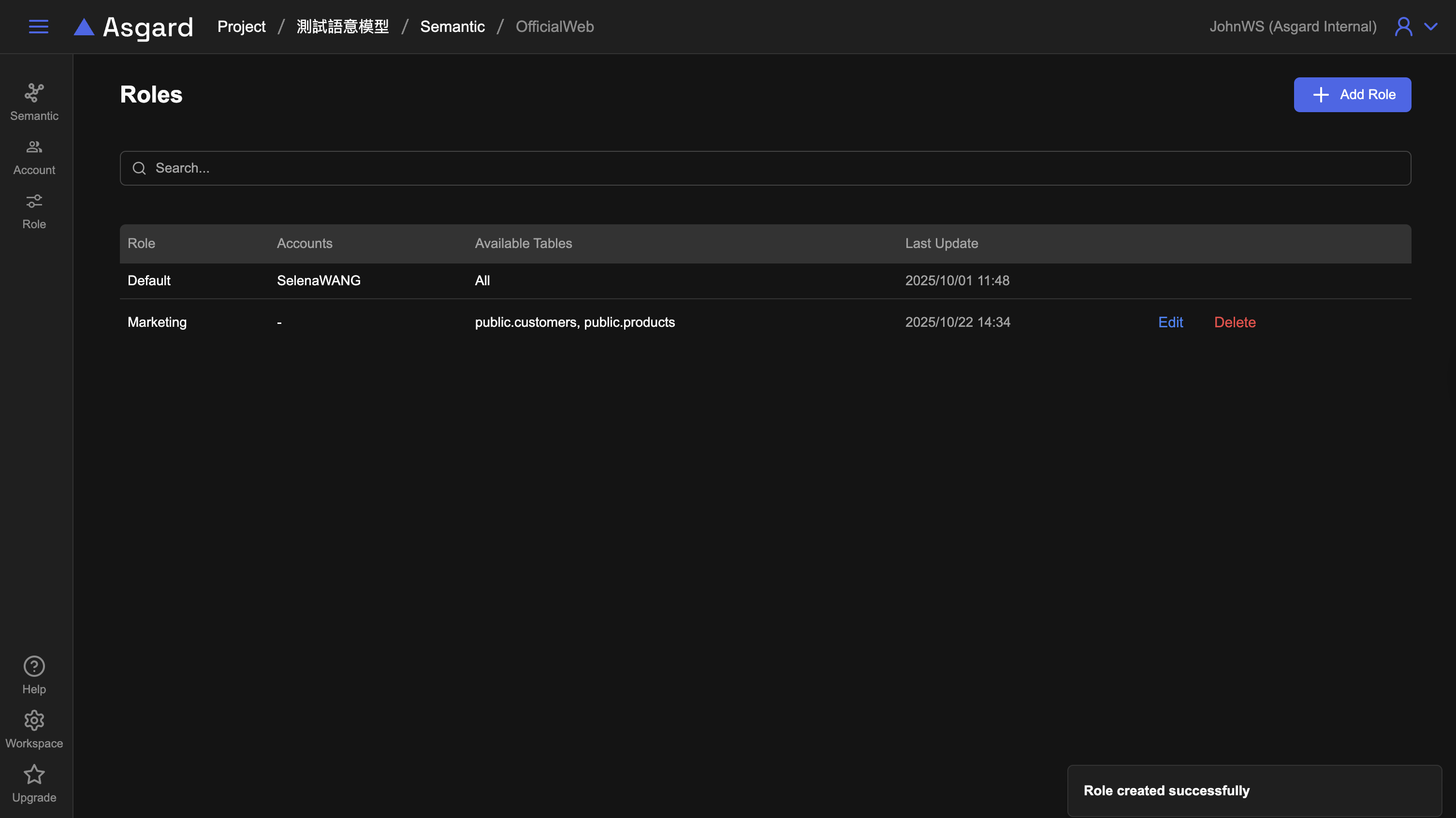 語意資料模型擁有獨立的權限角色管理功能,採用基於角色的存取控制 (RBAC) 來管理 Data Insight 的使用者在系統中存取的模型與操作。您可以為不同部門例如 Finance, Marketing, Sales, Engineering 建立對應的角色以符合 Need-to-know 原則。