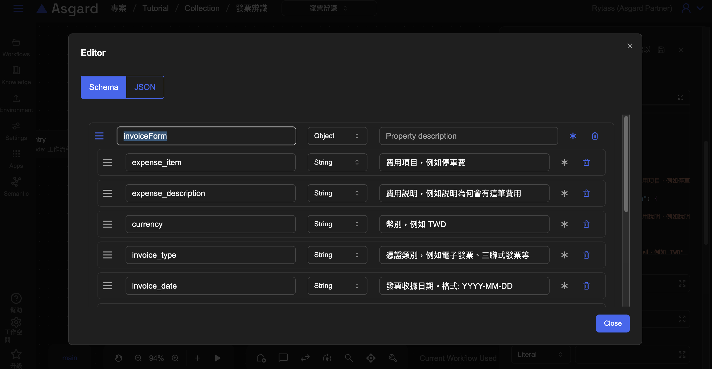 除了使用標準 JSON 語法進行編輯外,Asgard 也提供了圖形化介面(GUI)編輯器,讓您能夠以更直覺的方式編輯 Schema 格式的 JSON 文件。