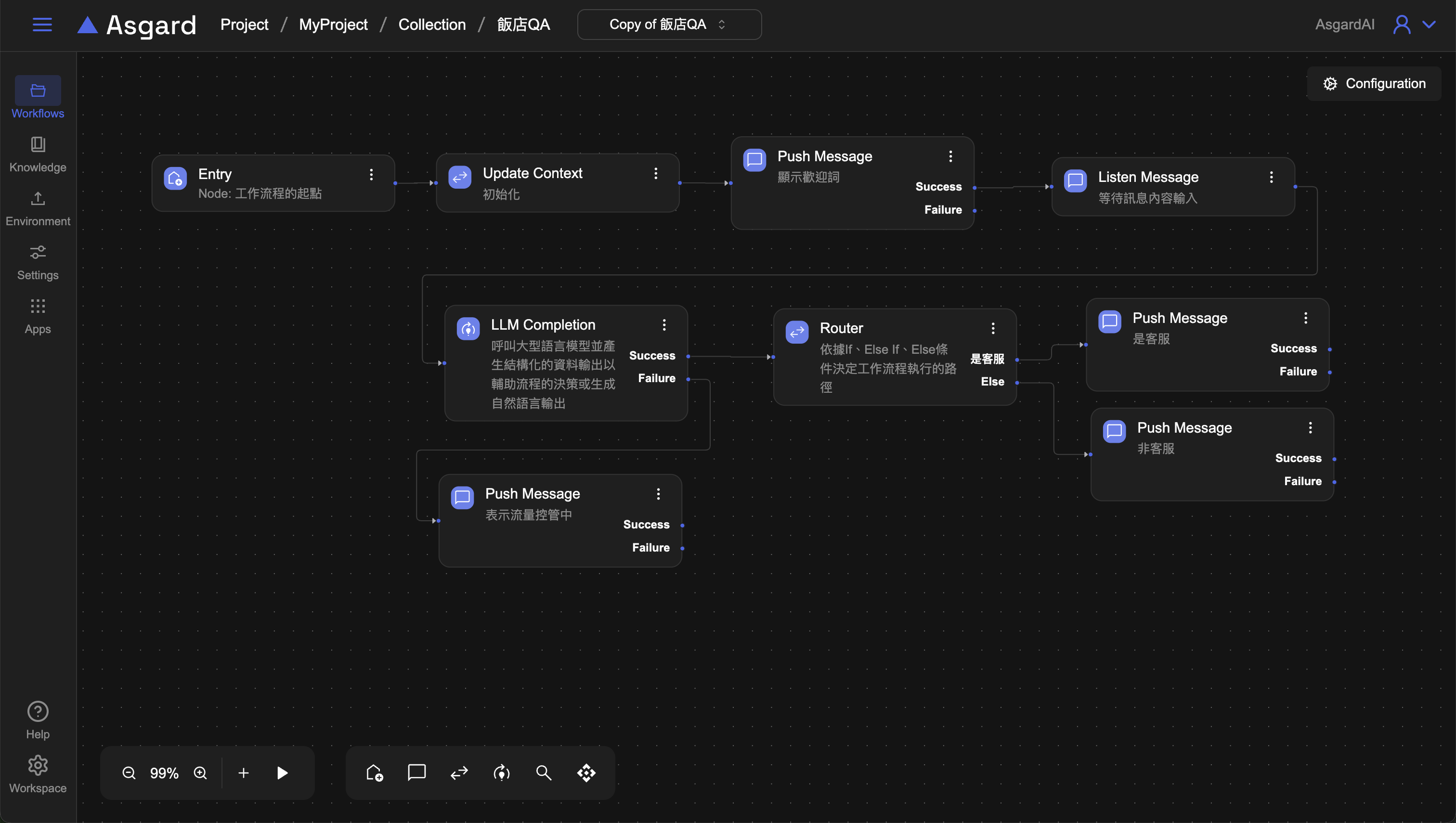 點擊該 workflow 進入 workflow 工作區,此處 Asgard 已經預設幫您建好了初始的工作流程起點。