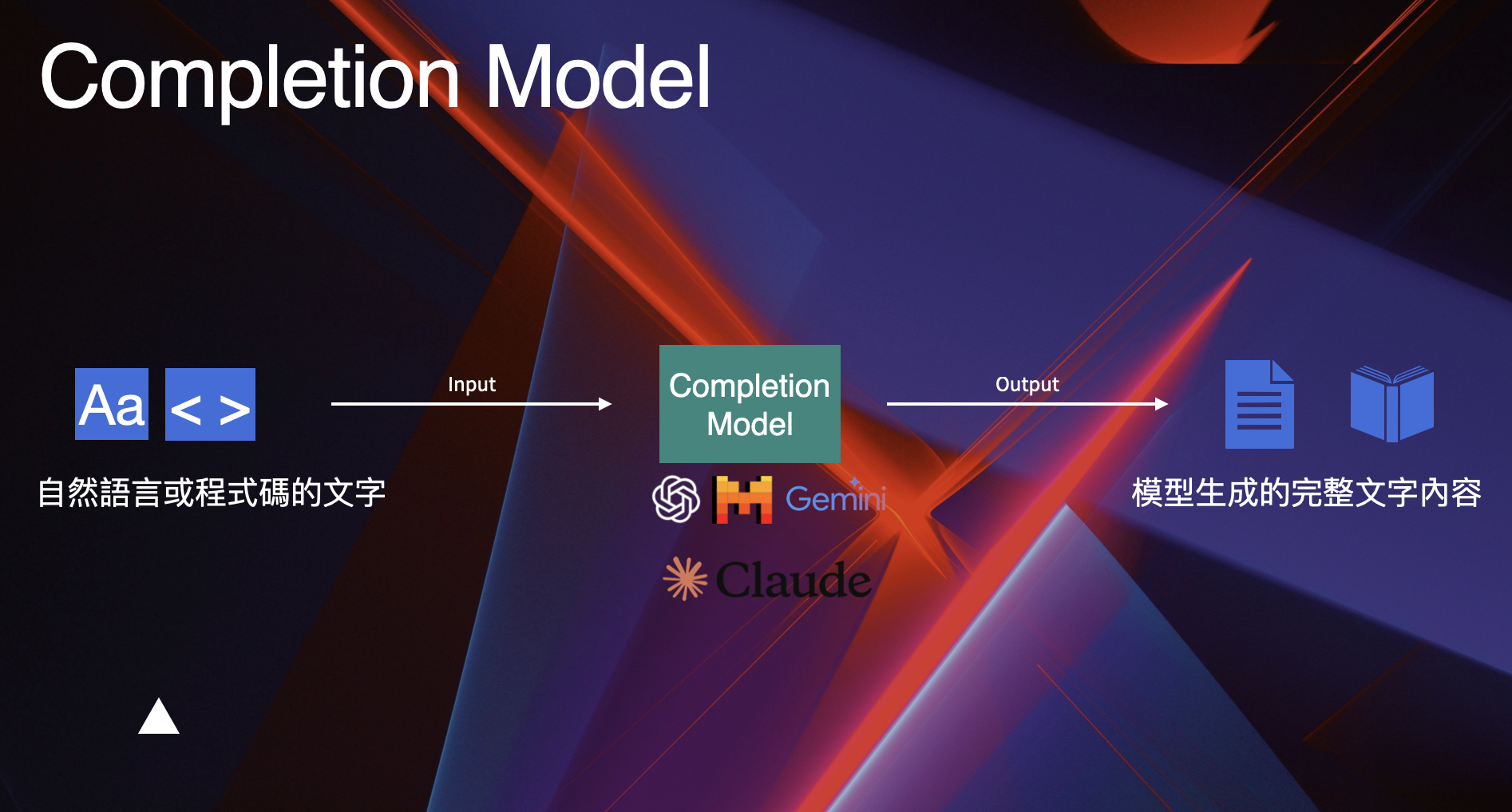 Completion Model 是一種 LLM 的應用方式,可接收提示詞(prompt)後生成後續文字(completion),例如:GPT-4o, Claude 3.5 Sonnet, Gemini 2.0 Flash等。用於寫東西、回覆東西,常見用途例如下: