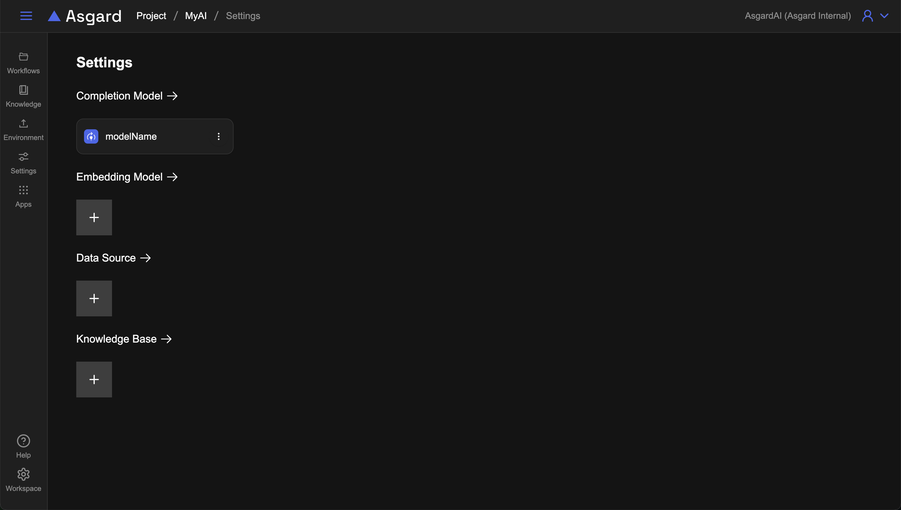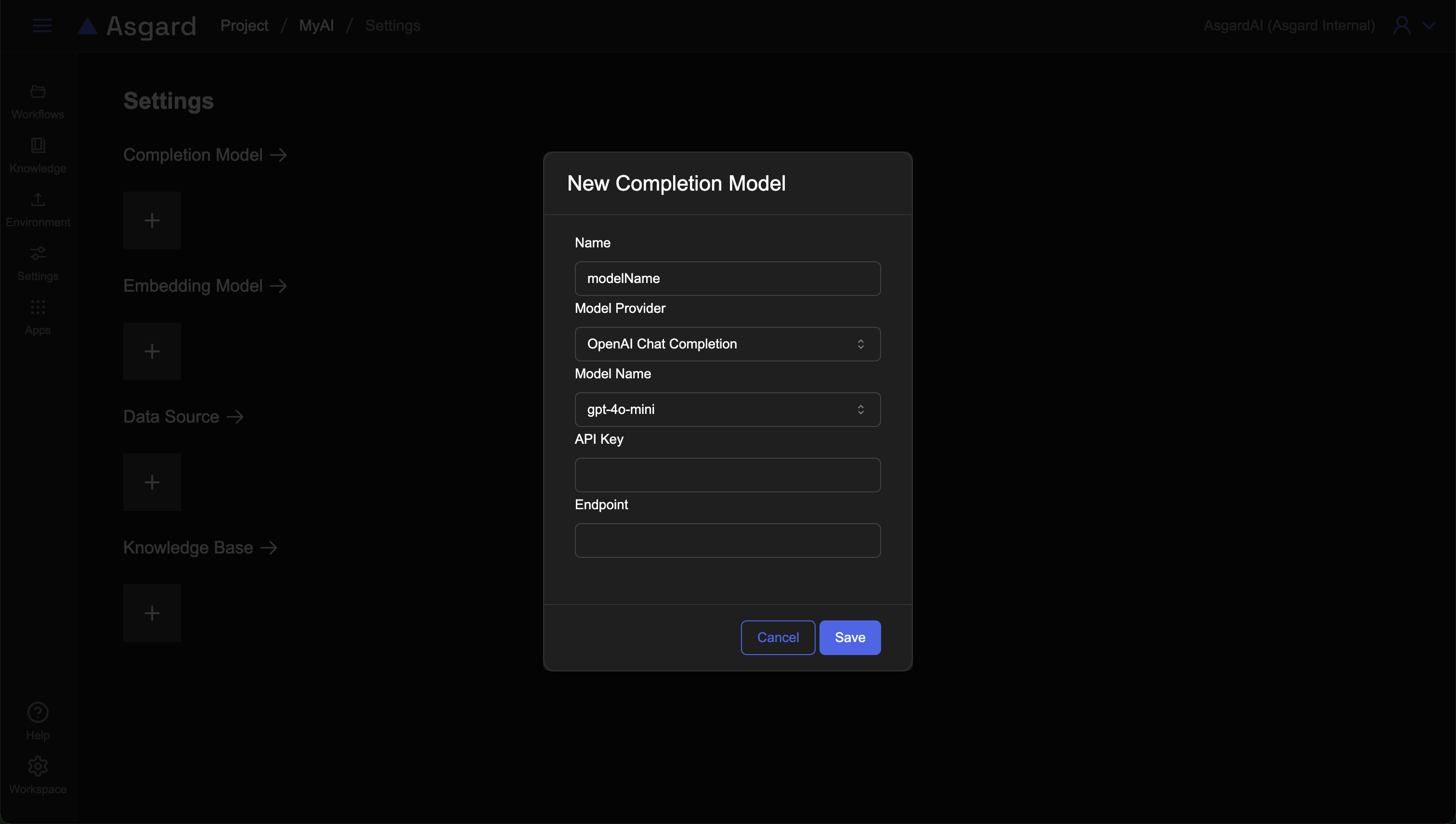 在 Completion Model 的區塊點擊「+」新增 Completion Model 並填入所需欄位後儲存。注意不同模型供應商所需填寫的欄位有可能不同,範例使用 OpenAI。