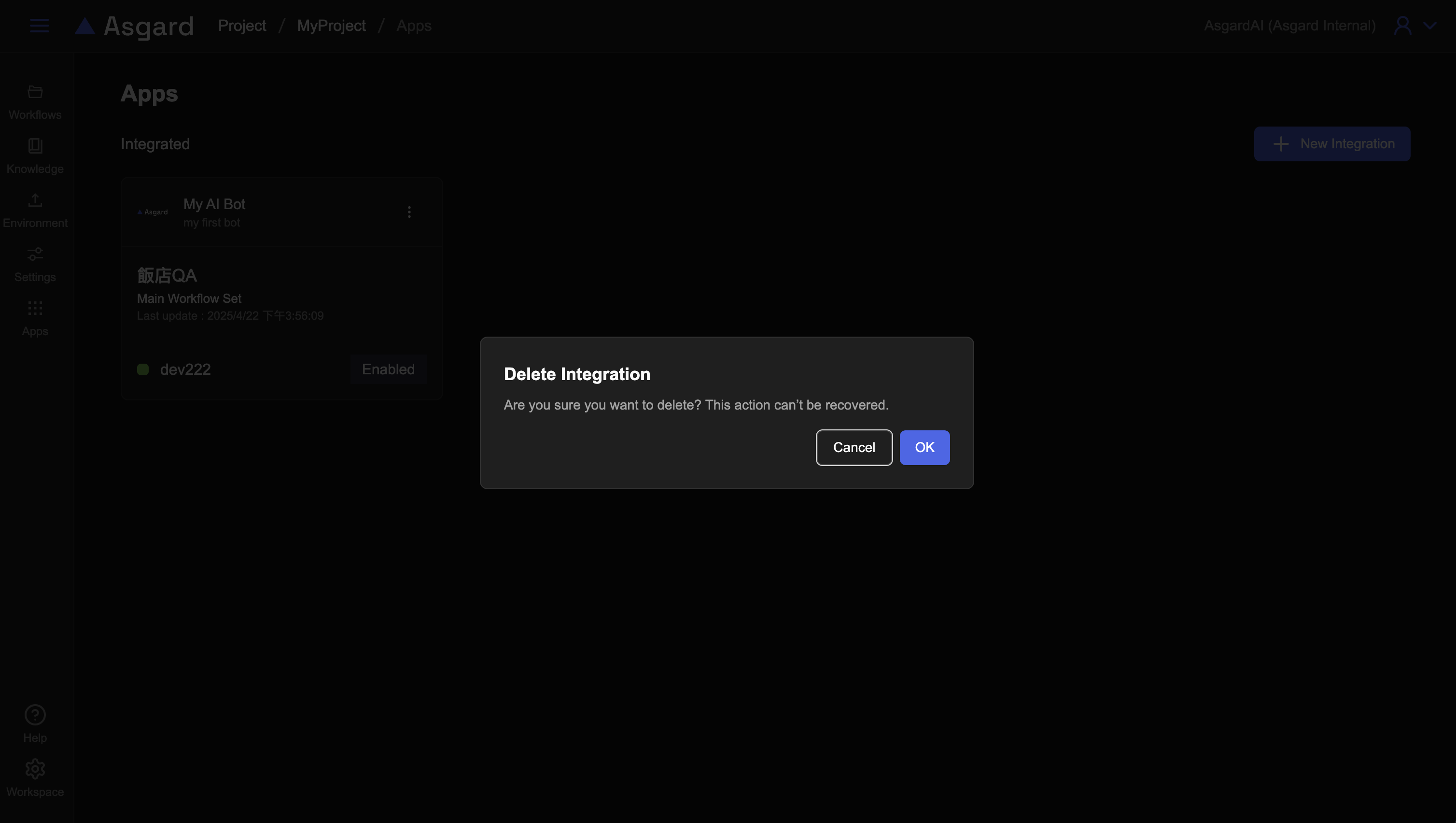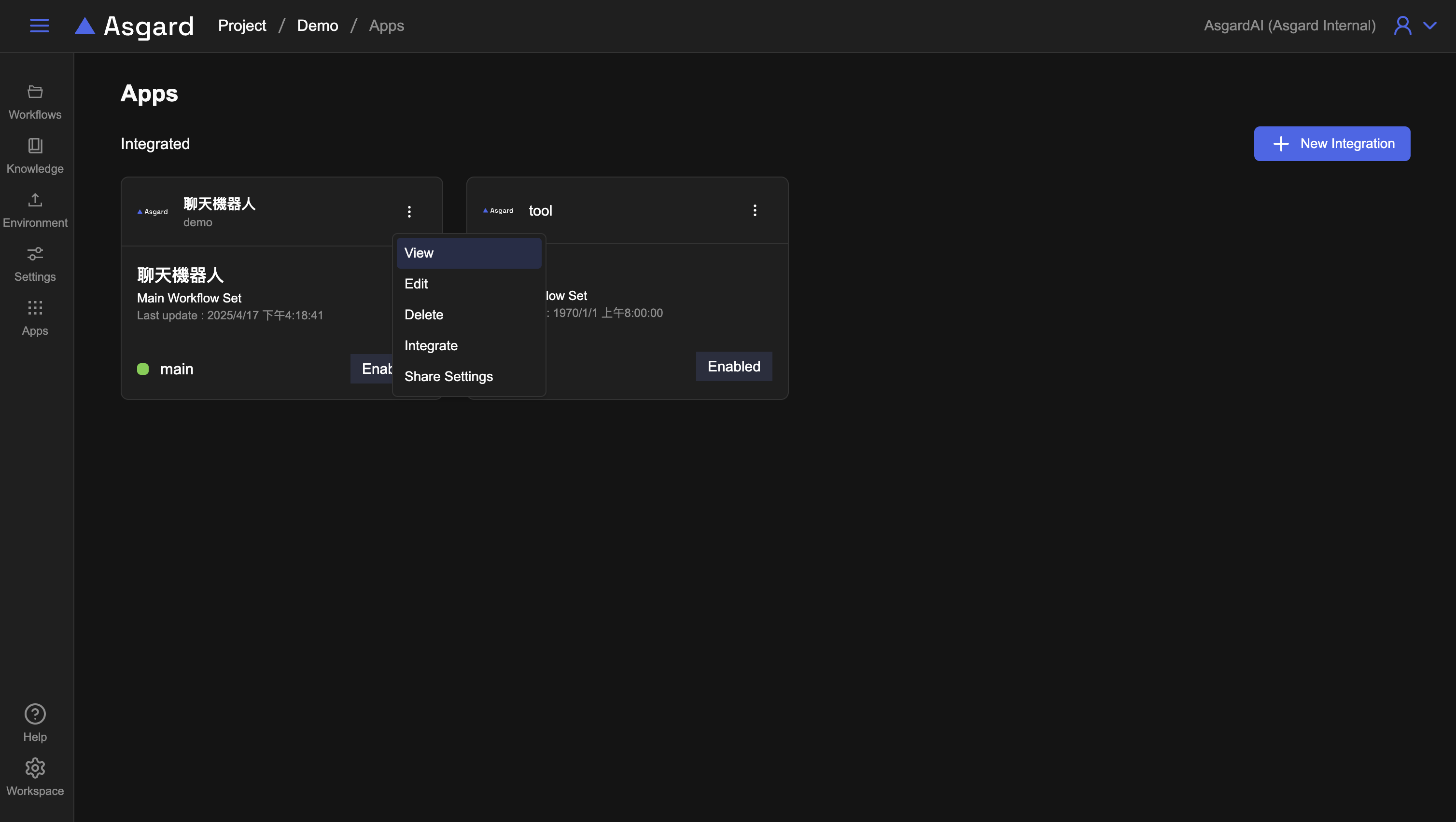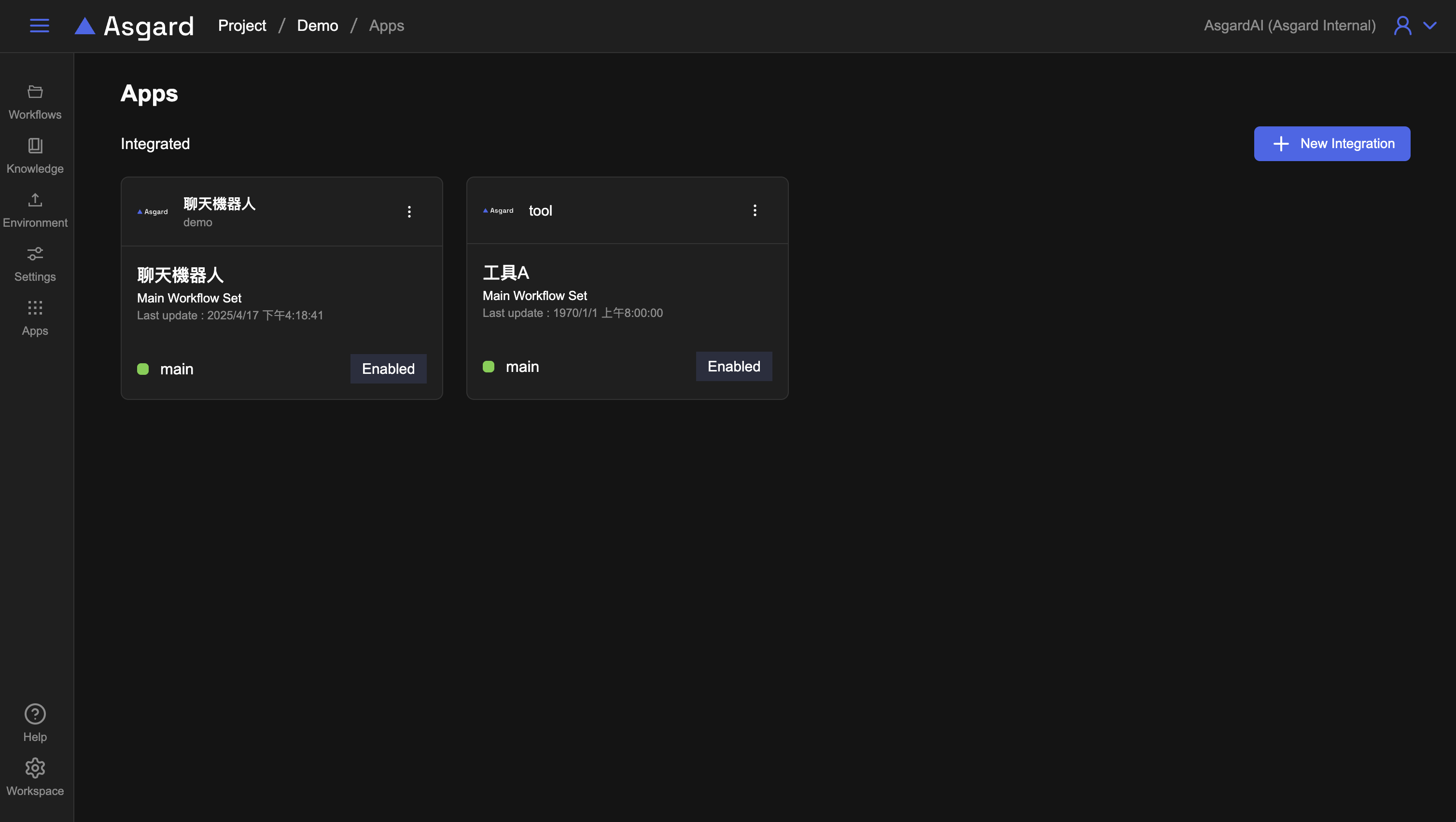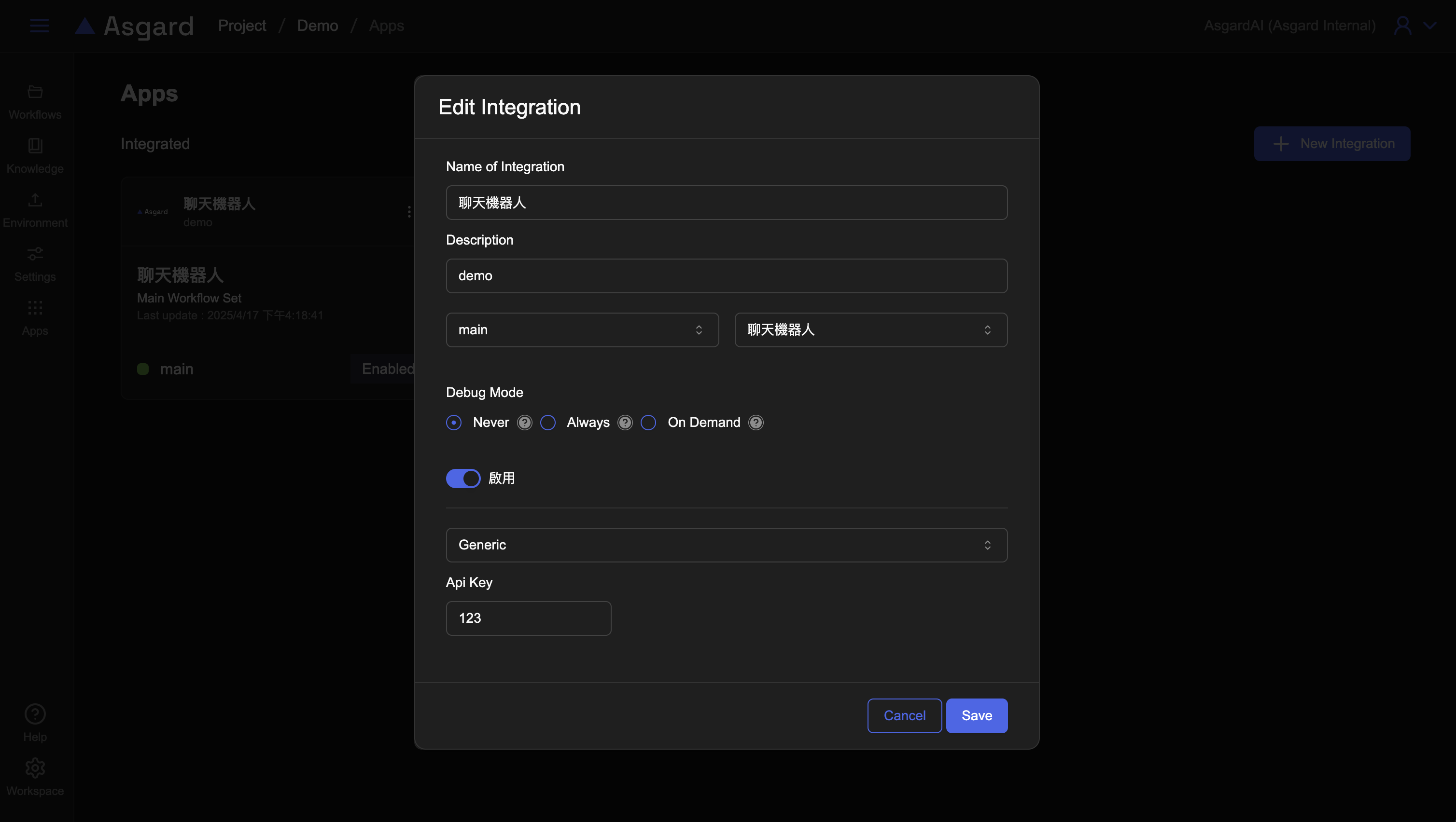 點擊左側 Apps 功能進入 AI App 功能區,首次進入會是空的,請點擊 New Integration 來建立一個新的 AI App 整合應用。接著填入對應的資訊並選擇應用類型即可,預設建立完成後會自動啟用該 App。