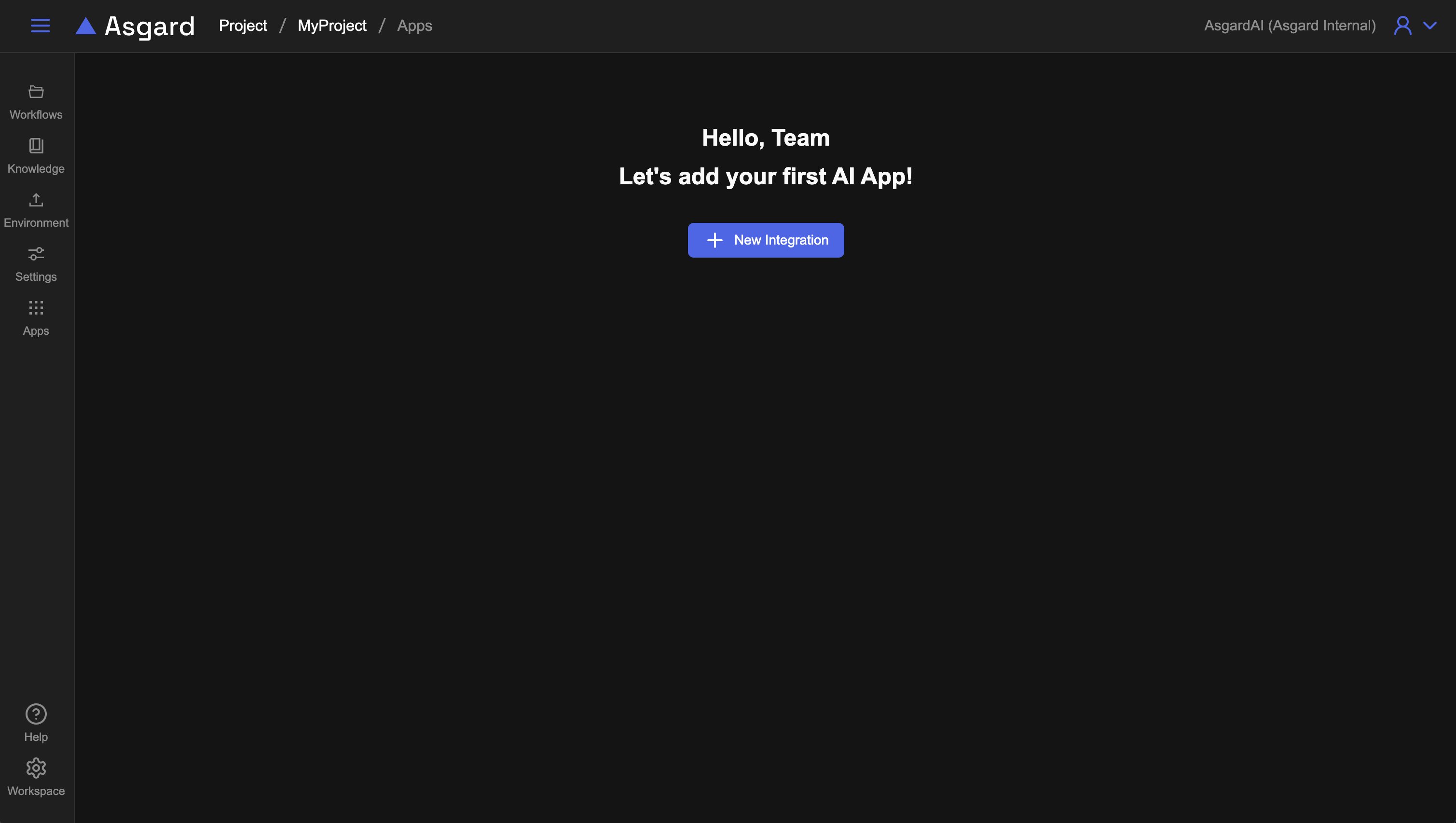 在 Project 底下左側的功能列選擇 Apps 進入 Apps 應用頁面,首次建立 App 請點擊「New Integration」以繼續。